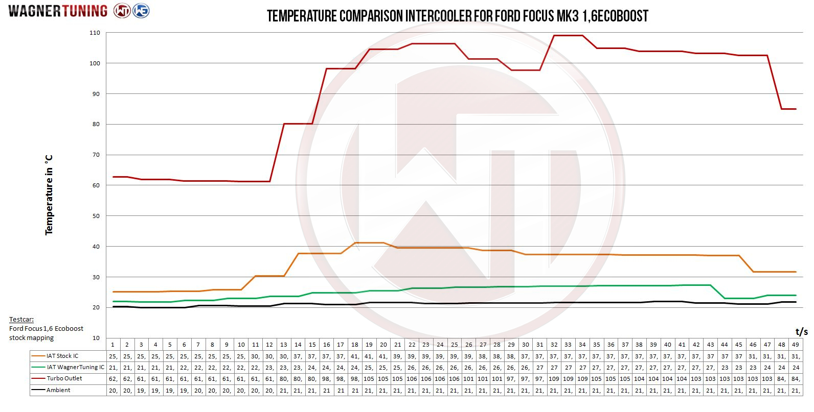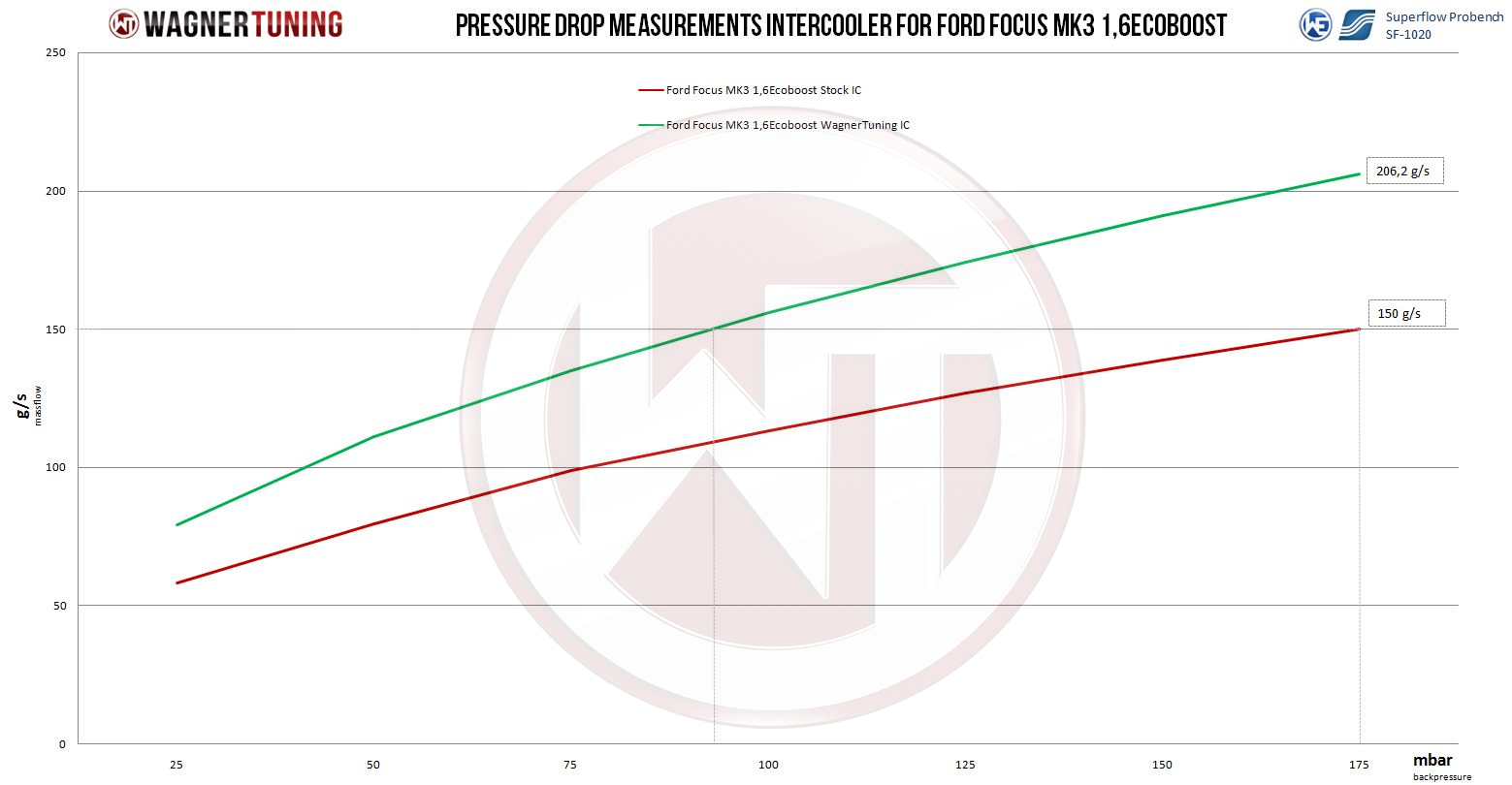 Podbijaj drogę dzięki Competition high performance intercooler kit do Ford Focus MK3.Chcesz wynieść osiągi swojego Ford Focus MK3 na wyższy poziom? Competition High Performance Intercooler Kit to ostateczna odpowiedź na Twoje potrzeby. Dzięki zaawansowanej technologii i dopasowanej konstrukcji intercooler zapewnia nie tylko większą moc, ale też ekscytujące wrażenia z jazdy.Przy wymiarach rdzenia intercoolera 640 mm x 200 mm x 110 mm (14,080 cc) oferuje on imponująco o 21% większą powierzchnię przepływu oraz aż o 235% większą objętość powietrza doładowującego w porównaniu z seryjnym intercoolerem. Przekłada się to na wyraźny wzrost mocy i lepszą wydajność chłodzenia. Competition high-performance core zapewnia nie tylko najwyższą skuteczność chłodzenia, ale także odpowiedni przepływ powietrza do sąsiednich podzespołów. Mimo wysokiej wydajności intercooler waży jedynie 10,3 kg.Odlewane metodą swobodną, projektowane w CAD aluminiowe komory końcowe gwarantują optymalny przepływ wewnętrzny. Efekt to intercooler o wyraźnie niższym oporze przepływu niż model seryjny.Wszystkie nasze intercoolery są wyposażone w powłokę antykorozyjną, która nie tylko chroni przed wpływem środowiska, ale również charakteryzuje się doskonałym przewodnictwem cieplnym. Zapewnia to optymalne chłodzenie i zauważalny wzrost osiągów.Zestaw jest w pełni przygotowany do montażu i umożliwia bezproblemową wymianę seryjnego intercoolera. To prawdziwe plug-and-play, które oszczędza czas i wysiłek. Stawiamy na najwyższą jakość i bezpieczeństwo. Wszystkie nasze produkty przechodzą rygorystyczną kontrolę jakości, aby spełniały najwyższe standardy. Ten intercooler został przetestowany w ekstremalnych warunkach i jest szczelny przy ciśnieniu do 6 barów, dzięki czemu idealnie nadaje się do motorsportu.Koniec z ograniczeniami wydajności. Wybierz Competition high performance intercooler kit i odkryj nieoczekiwaną siłę swojego Ford Focus MK3. Już dostępny do Twojego Ford Focus MK3.Comp. Intercooler Kit Ford Focus MK3 1,6 EcoboostŚrednica przyłącza: Ø50 mm po obu stronachWymiary rdzenia seryjnego intercoolera:660 mm x 160 mm x 40 mmV=4,2 LiterA=1056 cm²Wymiary rdzenia Wagner Tuning intercooler:640 mm x 200 mm x 110 mmV=14,08 LiterA=1280 cm²Part number: 200001104Zawartość zestawu:1 intercooler1 komplet materiałów montażowych1 instrukcja montażu