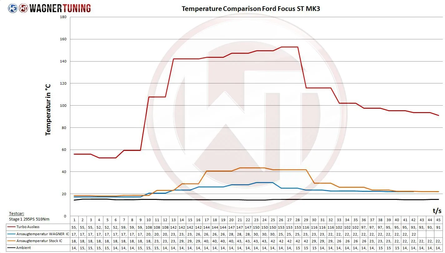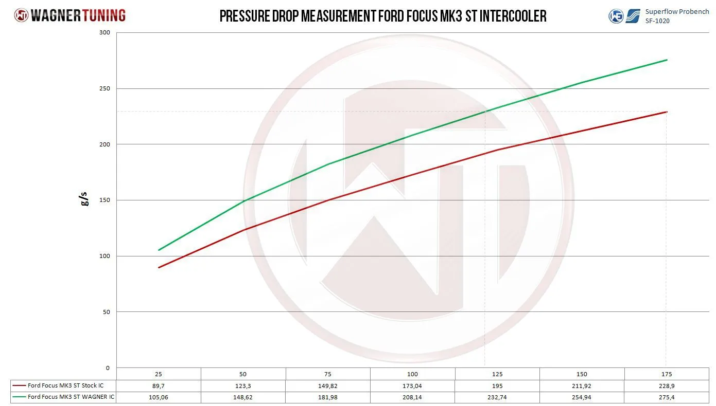 Zestaw Intercoolera Competition o wymiarach rdzenia (640 mm x 200 mm x 110 mm, pojemności 14,080 cm³), zapewniając o 24% większą powierzchnię czołową i 60% większą objętość w porównaniu z oryginalnym intercoolerem montowanym fabrycznie. Inżynierowie Wagner Tuning zwiększyli rozmiar i wydajność rdzenia intercoolera, a także ulepszyli konstrukcję boczków, aby usunąć wszelkie wąskie gardła OEM, co skutkuje zwiększonym natężeniem przepływu i poprawną chłodzenia przepływającego powietrza. Zbudowany z najwyższej jakości rdzenia Tube Fin z wewnętrznymi turbulatorami oraz w połączeniu z odlewanymi aluminiowymi boczkami zoptymalizowanymi przez CFD (dynamiczna symulacja przepływu) dla najlepszego możliwego wewnętrznego przepływu powietrza. Standardowe połączenia zostały wyeliminowane, a wlot i wylot zwiększone do średnicy Ø 65mm. Ten zestaw to najlepszy wybór, jeśli chodzi o wzrost wydajności i niskie temperatury wlotowe. Intercooler pokryty powłoką antykorozyjną o wysokim współczynniku odprowadzaniu ciepła. Zestaw kompletny i prosty w montażu dzięki idealnemu dopasowaniu. Wszystkie produkty Wagner Tuning poddawane są rygorystycznym kontrolą po procesie produkcyjnym. Zestaw intercoolera Competition pasuje do: Ford Focus MK3 ST250 2,0L 184KW/250PS (2012+) zestaw zawiera: 1 intercooler 1 zestaw montażowy 1 instrukcja montażu
