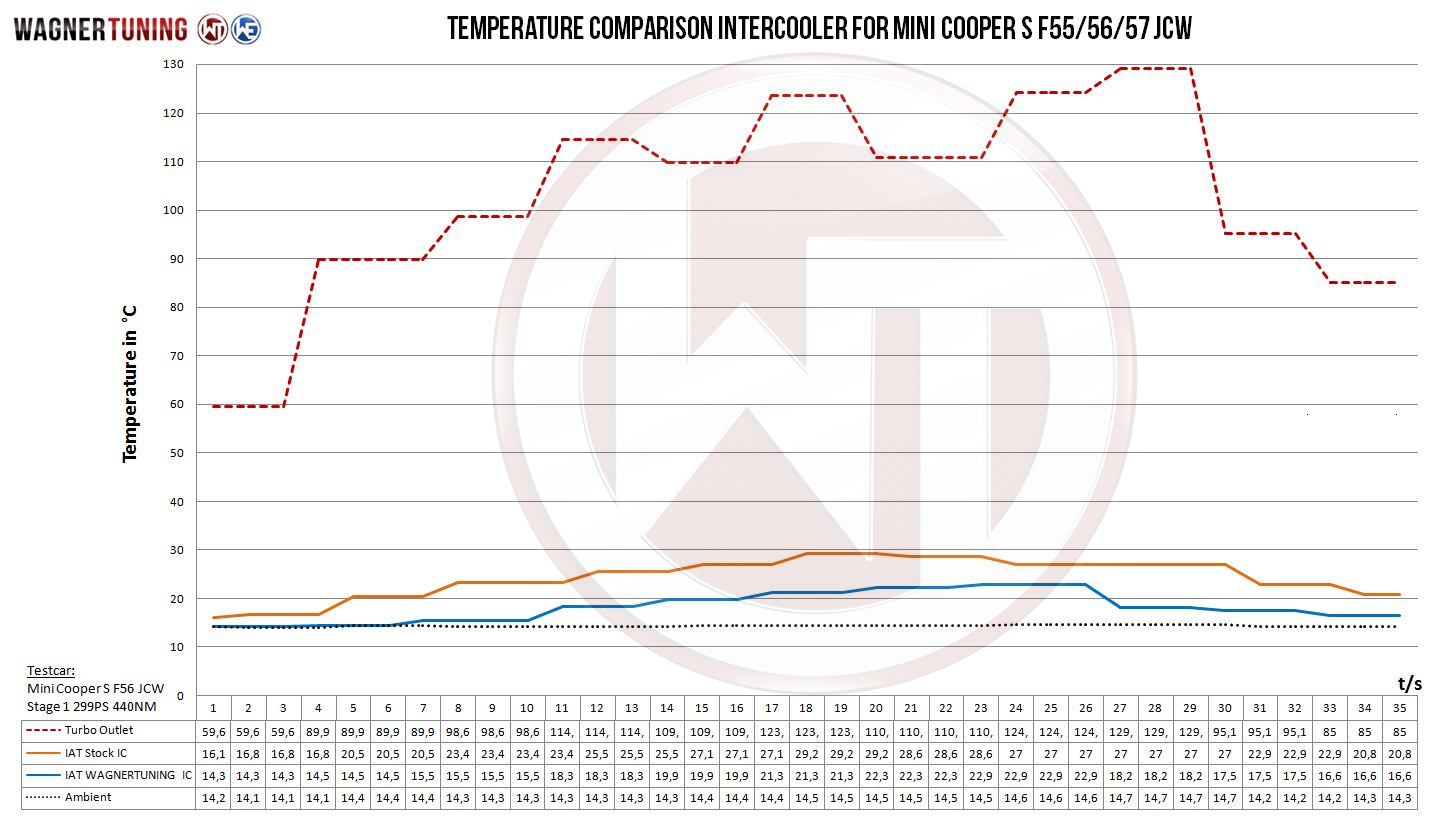 With mesh dimensions of 590mm x 225mm x 145mm (stepped) and a generous total volume of 16.6 liters, this intercooler offers an amazing 30% larger flow area and a whopping 47% more charge air volume compared to the factory intercooler. Our Competition high-performance network is a true masterpiece of engineering. Equipped with internal turbulators, it provides top-notch cooling performance. And all this at a total weight of just 9.65 kg, despite its imposing size. The end boxes of the intercooler are made of high-quality cast aluminum and have been optimized down to the last detail using flow analyses in the CFD system. This intercooler kit was developed specifically to meet the high demands of the Mini Cooper S JCW. Our intercooler has significantly less overall backpressure than the factory intercooler. This means your engine will run more efficiently and with more power.