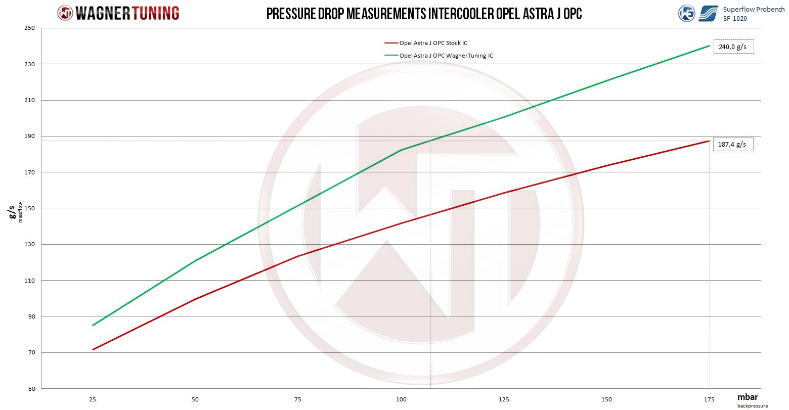 Inżynierowie Wagner Tuning zwiększyli rozmiar i wydajność rdzenia intercoolera, a także ulepszyli konstrukcję boczków, aby usunąć wszelkie wąskie gardła OEM, co skutkuje zwiększonym natężeniem przepływu i poprawą chłodzenia przepływającego powietrza.