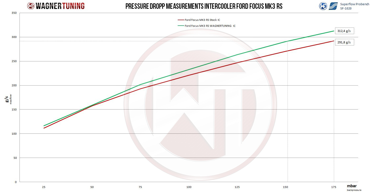 Inżynierowie Wagner Tuning zwiększyli rozmiar i wydajność rdzenia (Tube i Fin) intercoolera, a także ulepszyli konstrukcję boczków, aby usunąć wszelkie wąskie gardła OEM, co skutkuje zwiększonym natężeniem przepływu i poprawą chłodzenia przepływającego powietrza.
