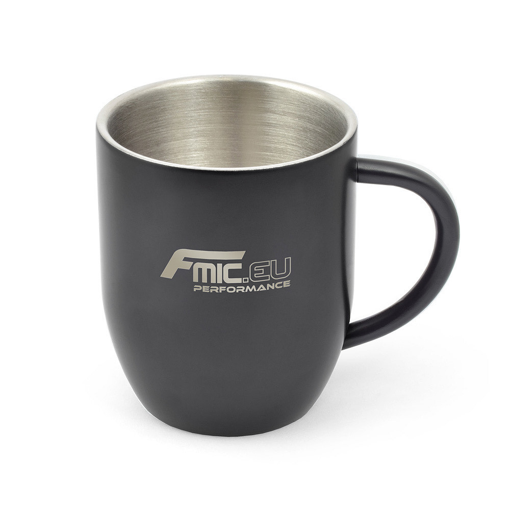 Elegancki, czarny kubek FMIC.EU o pojemności 380 ml z dwiema ściankami ze stali nierdzewnej. Wewnątrz stal o podwyższonej jakości 18/8. Pokryty błyszczącym lakierem. Nadruk wykonany jest z najwyższej jakości graweru tak, aby utrzymywał się jak najdłużej. Rozmiar logo: 40x40 mm. Średnica kubka: 8,2 cm. Wysokość kubka: 9,8 cm.
