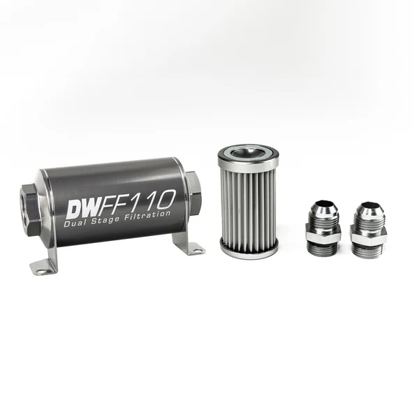 In-line fuel filter element and housing kit, stainless steel 5 micron, -10AN, 110mm. Universal