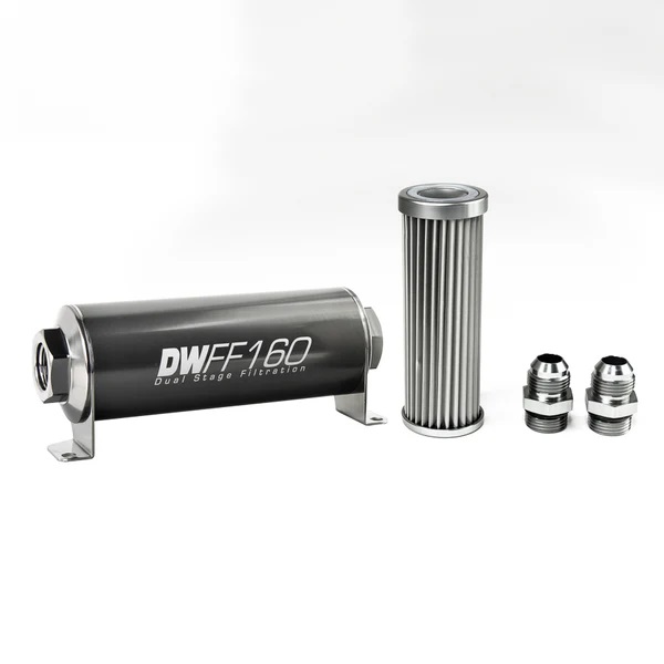 In-line fuel filter element and housing kit, stainless steel 5 micron, -10AN, 160mm. Universal