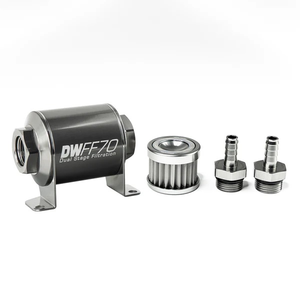 In-line fuel filter element and housing kit, stainless steel 5 micron, 3/8in hose barb, 70mm. Universal