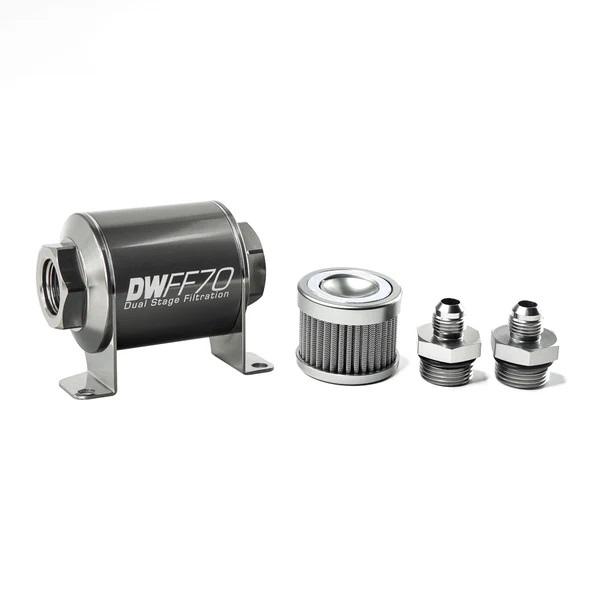 In-line fuel filter element and housing kit, stainless steel 10 micron, -6AN, 70mm. Universal