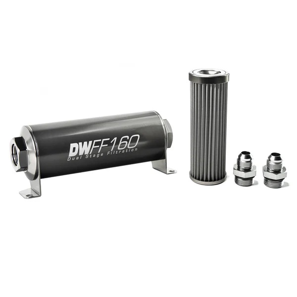 In-line fuel filter element and housing kit, stainless steel 40 micron, -8AN, 160mm. Universal