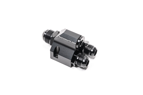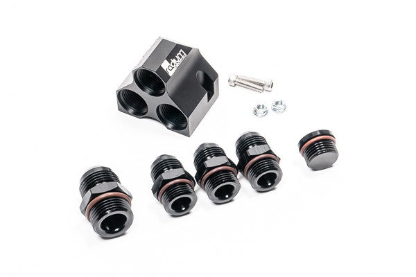 Blok dystrybucyjny paliwa wykonany z aluminium 6061 i wyposażone w trzy żeńskie porty AN ORB po jednej stronie i jeden większy żeński port AN ORB po przeciwnej stronie.