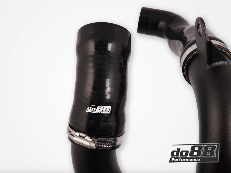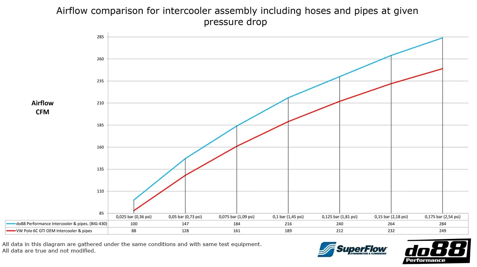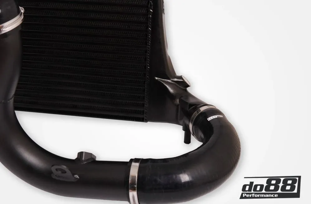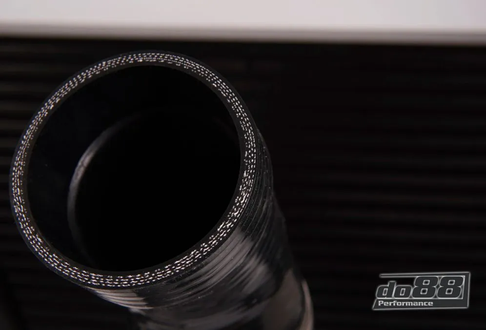 Zalety zestawu do88 BigPack w porównaniu do OEM (seryjny intercooler/rury): – Większa objętość rdzenia: 8490 cm³ (6376 cm³), o 33% większa! – Większa aktywna powierzchnia chłodzenia: 1198 cm² vs 797 cm², o 50% większa! – Przepływ powietrza przy spadku ciśnienia 0,15 bara/2,18 psi: 253 CFM (224 CFM), do88 o 13% wyższy! – Rura posiada jedno przyłącze do wtrysku metanolu (1/8 -27 NPT). Rura jest dostarczana z zaślepką w tym przyłączu.