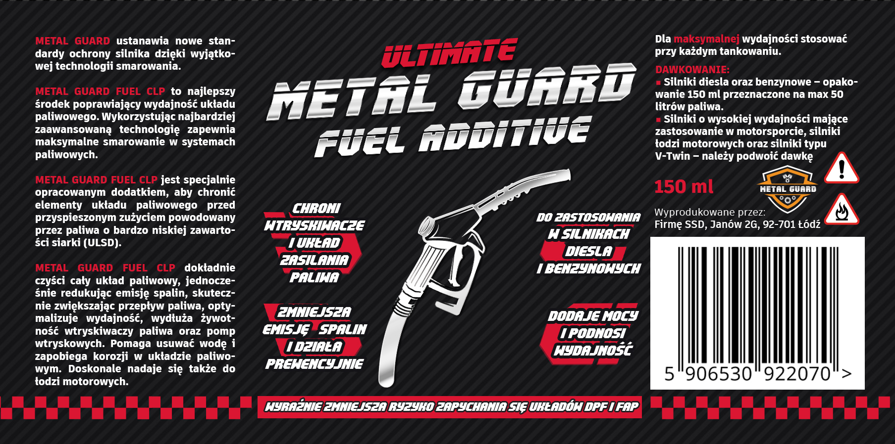 METAL GUARD FUEL to najlepszy środek poprawiający wydajność układu paliwowego i poprawiający smarowność paliwa. Wykorzystując formułę Zaawansowanego Filmu Olejowego zapewnia maksymalne smarowanie, tak w benzynie, jak i pozostałych systemach paliwowych. FUEL CLP jest specjalnie opracowany, aby chronić przed przyspieszonym zużyciem powodowanym przez paliwa o bardzo niskiej zawartości siarki (ULSD). FUEL CLP dokładnie czyści cały układ paliwowy, jednocześnie redukując emisję spalin, ułatwiając przepływ paliwa, poprawiając moc, osiągi, wydłużając żywotność wtryskiwaczy paliwa, pomp wtryskowych i żywotność filtra paliwa. Inne zalety to eliminacja osadów, zwiększona efektywność spalania paliwa, poprawiona atomizacja paliwa, usuwanie wody i zapobieganie korozji w układzie paliwowym.