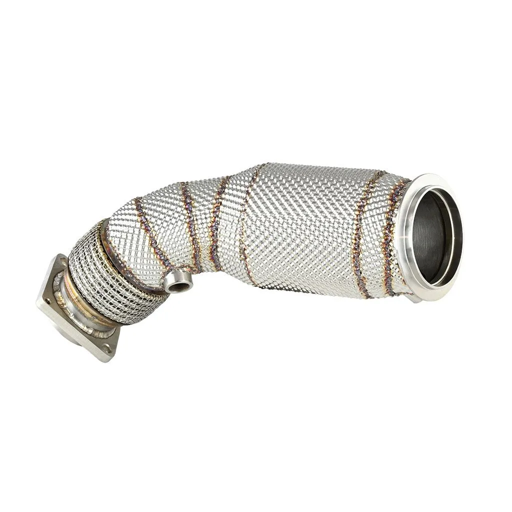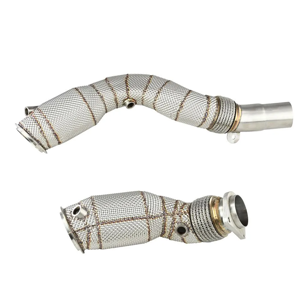 Downpipe Fmic.Pro BMW F80 M3 S55 wersja USA, 3.0L biturbo , 2014+, 431km Downpipe to nieodzowny element tuningu każdego turbodoładowanego samochodu. Po jego zamontowaniu zostaje odetkany układ wydechowy dzięki czemu odczuwalnie poprawia się "dół" silnika, czyli znika efekt tzw. turbo dziury oraz zwiększa się moc i moment obrotowy. Racing Downpipe Fmic.Pro to nowa jakość i wytrzymałośc elementów układu wydechowego. Nasze DPy wykonane są z wysoko gatunkowej stali kwasoodpornej o grubości ścianki 1,5mm. Każdy składnik produktu wykonany jest starannie w technologii CNC co przekłada się na powtarzalność gotowego elementu . W produkcji DP zostały użyte łączniki elastyczne które posiadają wewnętrzny peszel, który znacznie wzmacnia całą konstrukcje dzięki czemu nie ma mowy o zasysaniu się całości do środka. Dodatkowo Downpipe jest pokryty inconelem, czyli najlepszą ochroną termiczną na świecie , który dzięki odporności na utlenianie i korozję znajduje zastosowanie w przemyśle lotniczym, a jego temperatura topnienia sięga aż 1300’C. Materiał ten optymalizuje kontrolę temperatury, obniżając temperaturę w komorze silnika i podnosząc temperaturę gazów spalinowych , przyspieszając gazy i uzyskując większy przepływ i prędkość spalin. Średnica zewnętrzna – 70 mm Grubość flanszy – 10mm Downpipe posiada następujące przyłącza na każdą z rur: - dwa gniazda na sondę lambda na każdą z rur Downpipe posiada katalizator Euro 3 o przepustowości 200 cpsi
