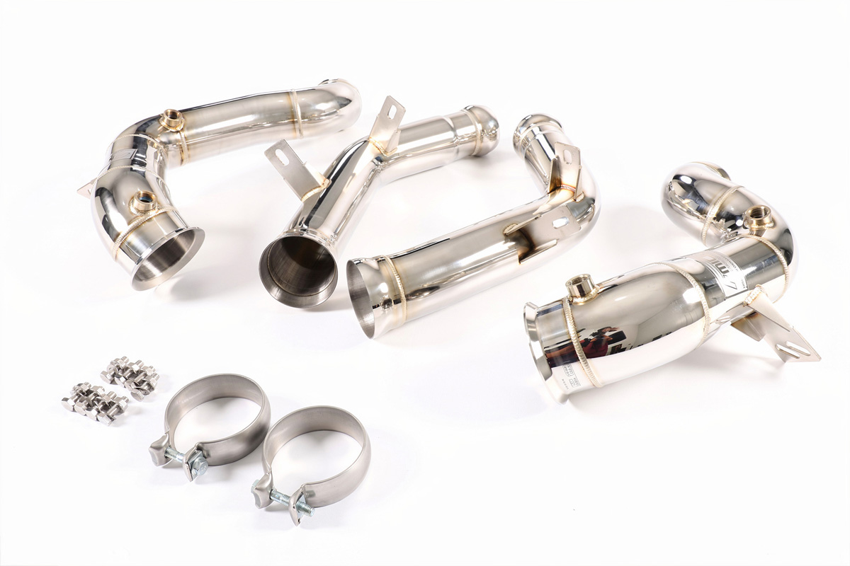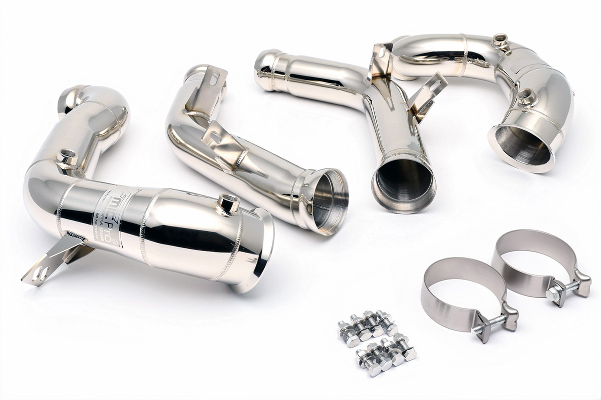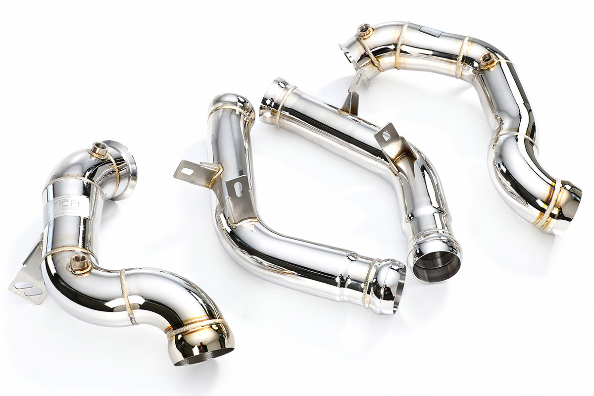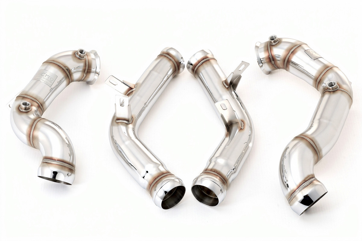 Downpipe FMIC.Pro Mercedes E63 S W213 4.0 M177 2017-2023 Downpipe to nieodzowny element tuningu każdego samochodu turbodoładowanego. Jego montaż pozwala „odetkać” układ wydechowy, co bezpośrednio przekłada się na poprawę osiągów – szybszą reakcję turbiny, zniwelowanie efektu tzw. turbo dziury oraz zwiększenie mocy i momentu obrotowego, zwłaszcza w niskim i średnim zakresie obrotów. Dodatkowo downpipe nadaje układowi wydechowemu bardziej rasowe brzmienie i poprawia kulturę pracy całego systemu doładowania. Downpipe FMIC.Pro to gwarancja najwyższej jakości i wytrzymałości. Element został wykonany z wysokogatunkowej stali nierdzewnej o grubości ścianki 1,5 mm, co zapewnia pełną odporność na ekstremalne temperatury oraz korozję. Flansze wycinane w technologii CNC o grubości 10 mm gwarantują idealne spasowanie z turbosprężarką oraz dalszą częścią układu, a spawy wykonane metodą TIG zapewniają solidność i estetykę konstrukcji. Cechy: - Średnica 76mm / 3.0” - Gniazdo na sondę lambda- Stal SS304 - Flansze wycinane CNC, grubość 10 mm - Grubość ścianki: 1,5 mm - Spawany metodą TIG -Konstrukcja bez zwężeń, maksymalny przepływ spalin-Niezbędna modyfikacja przy tuningu, zapewnia lepszą efektywność pracy silnika po zwiększeniu mocy. -Poprawiona akustyka, głębszy, bardziej sportowy dźwięk układu wydechowego. -Precyzyjne spawy, gwarancja trwałości i szczelności konstrukcji. Silnik: 4.0L V8 Bi-Turbo M177 Dedykowany do:-Mercedes Benz E63 AMG W213 4.0 V8 Bi-Turbo 2017-2023 -Mercedes Benz E63 S AMG W213 4.0 V8 Bi-Turbo 2017-2023