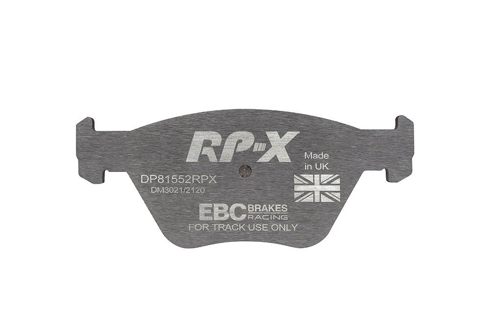Klocki hamulcowe EBC RP-X, To wyczynowe klocki o bardzo wysokich osiągach, zaprojektowane z myślą o pojazdach sportowych, intensywnie jeżdżących po torze. RP-X posiadaj wyższy poziom tarcia 0,55 i są dedykowane do samochodów z hamulcami działającymi progresywnie, nie posiadających agresywnego wspomagania. Zastosowanie klocków RP-X zapewnia wyższą siłę hamowania i szybszą reakcję, pozwala to zachować optymalny skok pedału hamulca. Zarówno klocki RP-1 i RP-X  to klocki wyczynowe o wysokiej sprawności hamowania oraz odporności na wysokie temperatury. Różnią się współczynnikiem tarcia RP-1 0,45 Mu, RP-X 0,55 Mu  Wyboru należy dokonać na podstawie charakterystyki układu hamulcowego i osobistych preferencji.   -Wykonane z mieszanki materiałów węglowych Kevlar®. -Współczynnik tarcia 0,55. -Zakres temperatur powtarzalnego hamowania w zakresie 100 – 850°C -Maksymalna temperatura skutecznego hamowania 1000°C. -Dłuższa żywotność w warunkach wyścigowych. -Stabilne i powtarzalne hamowanie na każdym okrążeniu. -Osiągi wyścigowe w najwyższych temperaturach wyścigowych. -Rewolucyjny system mocowania podkładek z haczykiem Nucap NRS. -Nie posiadają homologacji drogowej ECE R90.   EBC Brakes produkuje największą gamę klocków hamulcowych i tarcz hamulcowych na świecie, oferuje ponad 5000 produktów do większości pojazdów. EBC Brakes posiada dwie specjalistyczne  fabryki w Wielkiej Brytanii i USA. Oferta obejmuje klocki hamulcowe do samochodów osobowych, ciężarowych, motocykli i rowerów, produkuje również specjalistyczne układy hamulcowe do farm wiatrowych, klocki hamulcowe do zastosowań wojskowych, takich jak Humvee i samochody opancerzone. Rodzaje produkowanych klocków hamulcowych obejmują klocki hamulcowe aramidowe, spiekowe, ceramiczne, o wydłużonej żywotności oraz tarcze hamulcowe EBC żeliwne, nierdzewne oraz pływające. Pasuje do: