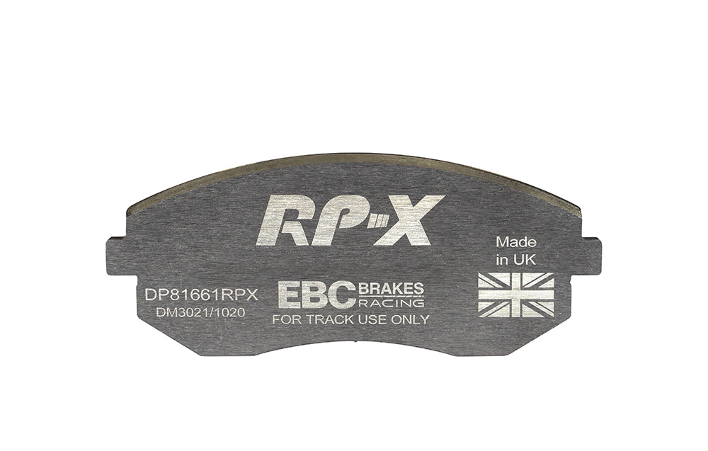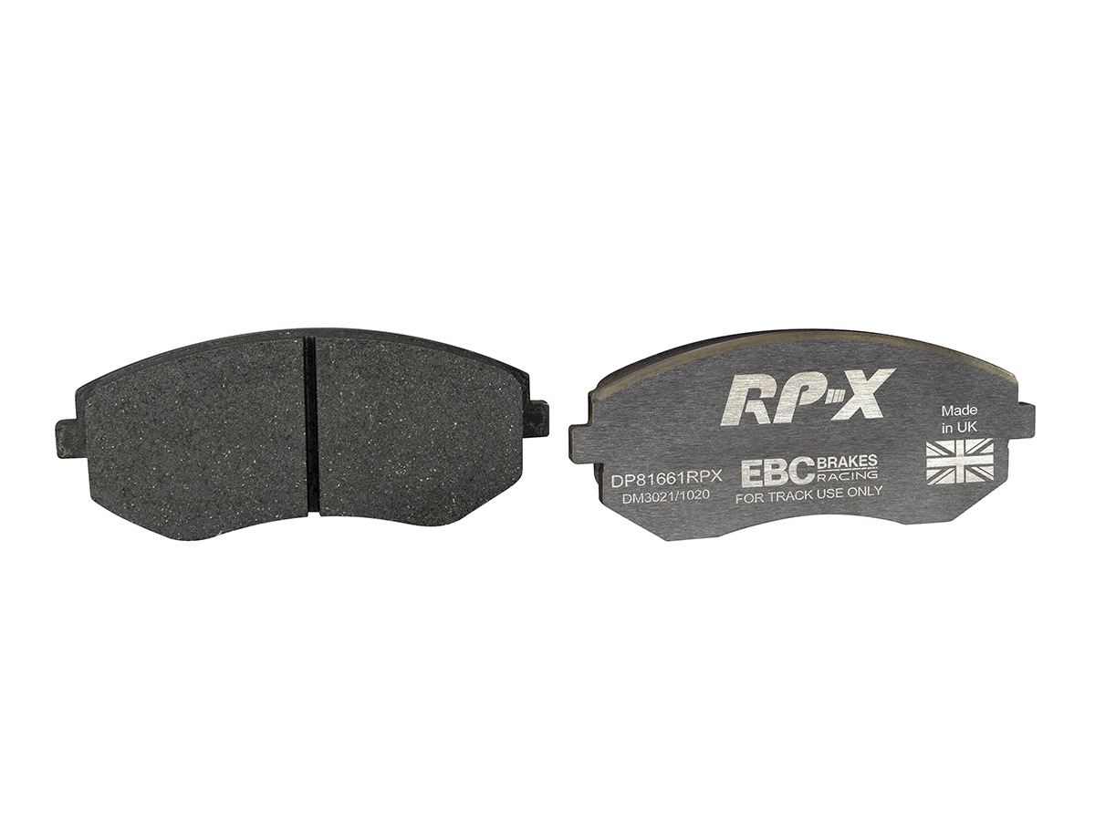 Klocki hamulcowe EBC RP-X, To wyczynowe klocki o bardzo wysokich osiągach, zaprojektowane z myślą o pojazdach sportowych, intensywnie jeżdżących po torze. RP-X posiadaj wyższy poziom tarcia 0,55 i są dedykowane do samochodów z hamulcami działającymi progresywnie, nie posiadających agresywnego wspomagania. Zastosowanie klocków RP-X zapewnia wyższą siłę hamowania i szybszą reakcję, pozwala to zachować optymalny skok pedału hamulca. Zarówno klocki RP-1 i RP-X  to klocki wyczynowe o wysokiej sprawności hamowania oraz odporności na wysokie temperatury. Różnią się współczynnikiem tarcia RP-1 0,45 Mu, RP-X 0,55 Mu  Wyboru należy dokonać na podstawie charakterystyki układu hamulcowego i osobistych preferencji.   -Wykonane z mieszanki materiałów węglowych Kevlar®. -Współczynnik tarcia 0,55. -Zakres temperatur powtarzalnego hamowania w zakresie 100 – 850°C -Maksymalna temperatura skutecznego hamowania 1000°C. -Dłuższa żywotność w warunkach wyścigowych. -Stabilne i powtarzalne hamowanie na każdym okrążeniu. -Osiągi wyścigowe w najwyższych temperaturach wyścigowych. -Rewolucyjny system mocowania podkładek z haczykiem Nucap NRS. -Nie posiadają homologacji drogowej ECE R90.   EBC Brakes produkuje największą gamę klocków hamulcowych i tarcz hamulcowych na świecie, oferuje ponad 5000 produktów do większości pojazdów. EBC Brakes posiada dwie specjalistyczne  fabryki w Wielkiej Brytanii i USA. Oferta obejmuje klocki hamulcowe do samochodów osobowych, ciężarowych, motocykli i rowerów, produkuje również specjalistyczne układy hamulcowe do farm wiatrowych, klocki hamulcowe do zastosowań wojskowych, takich jak Humvee i samochody opancerzone. Rodzaje produkowanych klocków hamulcowych obejmują klocki hamulcowe aramidowe, spiekowe, ceramiczne, o wydłużonej żywotności oraz tarcze hamulcowe EBC żeliwne, nierdzewne oraz pływające. Pasuje do: