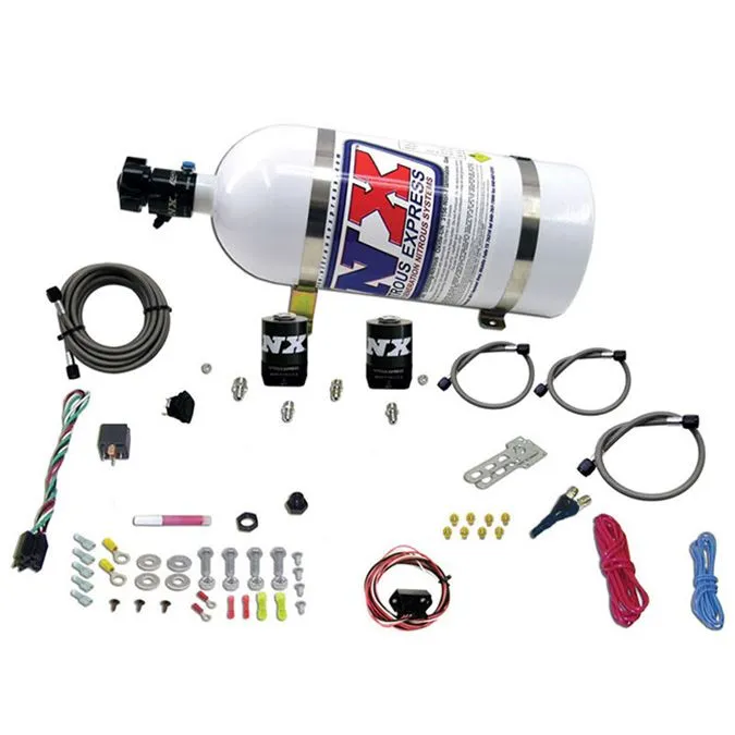 Drive-By-Wire Single Nozzle System for GM Vehicles (35-150Hp) Nitrous Express has combined performance, quality and easy installation in this new nitrous system engineered specifically for the 2010 Camaro. This system includes an Autolearn TPS switch which allows the nitrous to activate only at wide open throttle. A direct-plug-in Fuel Line Adapter is provided to simplify installation (no need to cut your factory fuel lines). The system also includes Lightning series fuel and nitrous solenoids, the patented Shark nozzle, a nozzle adapter, systems with a bottle include the new lightning bottle valve, extra long stainless braided N2O line, stainless bottle brackets, master arming switch, relay, relay harness and all necessary hardware to complete the installation. Includes jetting for 35, 50, 75, 100, 125 and 150HP. The system can be easily upgraded to power levels up to 250 wheel horsepower! Fits all 2010 V8 and V6 Camaros. Systems with a bottle include the billet aluminum Lightning 500 bottle valve. This valve not only looks great; It is packed with features including two integrated gauge ports, 5/8 siphon tube, a large .500 orifice and an improved flow path with only one 45 degree turn. The Lightning bottle valve looks great, flows great and weighs nearly one full pound less than our old style brass valve. If you have an aftermarket engine management system that is capable of adding nitrous enrichment fuel and want this system DRY (no fuel components), please contact us THE NITRO BOTTLE IS EMPTY! Instructions PDF
