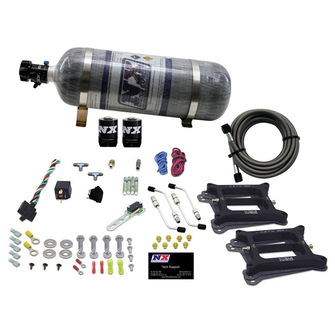 The Nitrous Express stage 6 Plate system is the perfect entry level nitrous system for the budget minded sportsman racer. These systems feature the most advanced technology using the conventional spraybarless design. The Phase 3 series plates are the Next Generation in nitrous performance and reliability. This new innovation in nitrous plate technology provides superior distribution and outstanding atomization. With no spray bars to sag, split, block airflow, or damage this is truly the Next Generation in nitrous plate technology. Systems come complete and include limited lifetime guaranteed Lightning solenoids, heavy duty 40 amp relay, nitrous bottle, stainless bottle brackets, and extra long supply line.