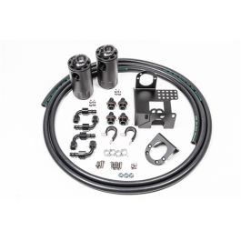An oil catch can is essential on a performance vehicle to protect the engine from elevated levels of crankcase blow-by accumulated from high performance driving. Excess oil saturated air circulating back into the air intake stream can lead to degraded performance. Radium Engineering catch cans feature large 10AN ORB ports, a 4AN ORB drain port, 2-step oil separation baffling, and an O-ring sealed dipstick. Benefits:-Effectively raises the octane and increased engine performance from cleaner inlet air -Prevents oil buildup in the intake and intercooler system walls, throttle body, intake manifold, etc. -Excessive oil collection can be an indicator of a damaged engine.-Lowers hydrocarbon emissions -Capacity: 7 fluid ounces each Details:These Radium catch can kits are compatible with 1990-2005 Mazda MX-5 Miata with both the 1.6L and 1.8L engines. They mount using OEM holes and integrate perfectly with the surrounding components.NOTE: the factory air intake box cannot be used with these kits. The kits are not designed for vent-to-atmosphere (VTA), thus are emissions and track legal. This closed loop system removes oil and sludge from the PCV gasses before it is routed to the engine to be burned. A closed loop system also promotes negative crankcase pressure for optimal performance. Furthermore, closed systems prevent unwanted oil vapors from entering the cabin. The dipsticks built into the catch cans allow easy inspection of accumulated fluid. No cutting, drilling or permanent modification to the vehicle is required. If purchasing the single catch can kit, there is enough components to plumb it to the PCV or the crankcase side of the engine. If purchasing the dual catch can kit, all engine breather ports will be isolated for optimal performance. When using the catch can on the PCV side, it runs inline with the PCV (positive crankcase ventilation) valve and retains it's factory function. When the intake manifold pressure is close to or greater than atmospheric pressure, the PCV "check" valve closes and, thus, this hose experiences no flow. Conversely, the PCV hose will experience "metered" vacuum when the engine is idling, steady state cruising, and decelerating. This would normally draw unwanted crankcase vapor, unspent fuel, and oil sludge into the intake manifold immediately after a high load run. Note: Because the Radium catch cans are pressure sealed, they are great for this boosted application so intake manifold connection is permitted. When using the catch can on the crankcase side, it runs inline with the crankcase breather port. At low loads it experiences atmospheric pressure, but when the engine is at high load (WOT), this hose will experience high flow out of the crankcase. This would normally lead to oil and sludge accumulation in the air filter intake pipe. Oil accumulation will occur in the intercooler which lowers the thermal efficiency properties of the heat exchanger and leads to decreased performance. Instruction PDF