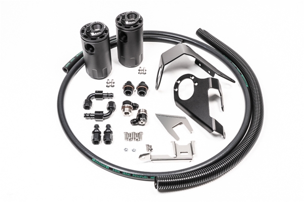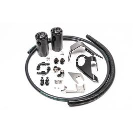 Radium Engineering catch cans feature large 10AN ORB ports, a 4AN ORB drain port, 2-step oil separation baffling, and an O-ring sealed dipstick. These kits mount using factory holes and integrate perfectly with the surrounding components. They do NOT vent to atmosphere (VTA), thus are emissions and track legal. Closed loop systems remove the oil and sludge from the PCV gasses before it is routed to the engine to be burned. A closed loop system also promotes negative crankcase pressure for optimal performance. Furthermore, closed systems prevent unwanted oil vapors from entering the cabin. The dipsticks built into the catch cans allow easy inspection of accumulated fluid. No cutting, drilling or permanent modification to the vehicle is required. To keep the symmetry that Nissan designed into the VQ37VHR engine bay, the catch cans secure to the RH strut tower and LH strut tower. No permanent modifications are required. The two oil catch cans run inline with the twin PCV valves integrated into the valve covers retaining factory functionality. When the intake manifold pressure is close to or greater than atmospheric pressure, the PCV "check" valves close and, thus, these hoses experience no flow. Conversely, the PCV hoses will experience "metered" vacuum when the engine is idling, steady state cruising, and decelerating. This would normally draw unwanted crankcase vapor, unspent fuel, and oil sludge into the intake manifold immediately after a high load run. NOTE: No inline check valve is required since Radium catch cans are pressure sealed. This means a direct intake manifold connection is permitted. FEATURES -Anodized oil catch can with integrated condenser and dipstick-Anodized aluminum Nissan specific mounting brackets-Anodized aluminum -AN adapter fittings and hose ends-Stainless steel P/S reservoir and relay box relocation brackets-Stainless steel mounting hardware Instruction PDF
