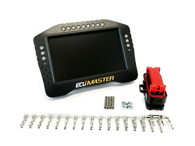 Advanced Display Unit We are proud to announce the new ECUMASTER Racing Dash family of products. We designed the ADU5 and ADU7 in response to market demand for a cost-effective dash display with logging capabilities. Our specific goal was to create a fully customizable, feature-rich, quality solution for competitive drivers. We consulted professional drivers and race engineers and designed the ADU to exceed their requirements. Above all, the ADU is designed to display all critical information in an easy to read manner, along with a comprehensive strategy for displaying alarms. Our Advanced Display Units are available in 5” and 7” versions. Both versions feature high resolution, high visibility anti-glare screens, guaranteeing perfect visibility in any lighting conditions. The ADU comes with multiple pre-configured pages, which can be customized by the end user to display data required at every race stage (e.g. practice, qualification, race, troubleshooting, etc.). Pages may be changed manually or automatically (based on defined conditions). Each channel displayed on a page (gauges, icons, texts, etc.) can be easily modified in real time using user-friendly Windows based software. Our comprehensive overlay system facilitates a multiple page display for important data (e.g. low oil pressure, best lap, etc.) independent of the actual page displayed. The ADU is also equipped with 15 ultra-bright RGB LEDs which can be used as an advanced gear-dependent shift light and can be modified by user-defined logic (for alarms, low fuel level, etc.).Using IR beacons or a GPS system, the dash turns into a powerful lap timer with a predictive timing function. By selecting the Qualification page, you enable a “Qualification Mode” which uses advanced predictive lap timing based on an automatically updated “best” reference lap. User configurable timers can be adjusted for additional functionality (pit stop timer, etc.). The ADU also supports thermal cameras for monitoring brake discs or tyre temperatures (up to 16 points per tyre).Communication with other devices in the car is provided via two built-in, independent CAN-BUS communication ports. CAN templates are provided for most popular ECUs, and are fully configurable, allowing you to connect our hardware to virtually any engine management system.To ensure that all features work seamlessly, our device is based on a 32-bit automotive controller paired with a state of the art graphics processor. This combination provides the perfect working environment for any engineer or driver and guarantees anti-aliased, high-quality graphics at 50 frames per second.For further analysis, data channels can be logged to a USB Flash drive with a frequency of up to 500Hz. Diving deep into the data is possible thanks to our state-of-art softwareAll of these “Must Have” features and more are housed in a rugged, specially CNC machined, black anodized enclosure. 1x Ecumaster ADU - 5' REV.1 (wersja nie IP65)1x Zestaw śrub i nakrętek montażowych1x Opis wyprowadzeń1x Karta gwarancyjna1x Wtyczka 776164-1
