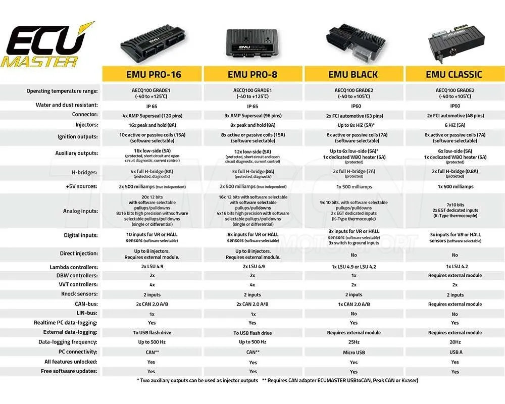 <p>EMU PRO to samodzielny system zarządzania silnikiem przeznaczony do profesjonalnych zastosowań w motosporcie, z kompleksowym zestawem funkcji i ogromnymi możliwościami tuningu. Oferuje precyzyjną kontrolę układu napędowego w połączeniu z najwyższą elastycznością w dostosowywaniu kalibracji silnika do najbardziej wymagających projektów. EMU PRO występuje w dwóch wersjach: EMU PRO 16 do zastosowań z dużą liczbą wejść/wyjść oraz EMU PRO 8 (do maksymalnie 8 cylindrowych silników).</p> <p>SPECYFIKACJA:</p> <p>- Zaawansowany model zasilania paliwem obejmujący zamkniętą pętlę krótko- i długoterminowego dostosowania mieszanki w połączeniu z innowacyjnym modelem sterowania dawki paliwowa daje wyjątkową dokładność sterowania wtryskiwaczami.</p> <p>- Oprogramowanie zostało zaprojektowane tak, aby zapewnić użytkownikowi niespotykaną elastyczność konfiguracji. Użytkownik może dostosować rozmiary wszystkich tabel w programie oraz kanały używane na każdej osi tabeli. Można również zmieniać wartości na osi X i Y, co zwiększa dokładność odczytów tabeli w nieliniowych częściach opisywanego modelu.</p> <p>- Elastyczny system z niestandardowymi funkcjami, liczbami, wejściami CAN i eksportami CAN,</p> <p>dobrze znany z Power Management Unit (PMU) i Advanced Display Unit (ADU).</p> <p>-Obsługiwane typy silnika : Czterosuwowy, dwusuwowy, wankla; do 12 cylindrów</p> <p>-Obsługa czujników tlenu: 2x wewnętrzny kontroler LSU 4.9, obsługa do 4 czujników</p> <p>-Pełne wsparcie do obsługi 2x elektronicznych przepustnic (DBW) z automatyczną kalibracją</p> <p>-Obsługa do czterech zmiennych faz z automatyczną kalibracją</p> <p>-2 x CAN 2.0A/B, 1 x LIN bus</p> <p>-Obsługa dwóch czujników spalania stukowego</p> <p>-Zapis logów do zewnętrznej pamięci USB</p> <p>-Rejestracja danych do 500 Hz</p> <p>-8 [4] wejść EGT (lub precyzyjnych wejść analogowych).</p> <p>-Łącznie 46[31] wyjść i 30[24] wejść</p> <p>-Indywidualne ustawienia użytkownika, liczby, tabele i wyjścia</p> <p>-Wodoodporna obudowa IP 65</p> <p>-Analiza parametrów on-line wyświetlana na wykresie</p> <p> </p> <p>*Funkcje wersji 8 podano w nawiasach kwadratowych</p>Produkty marki Ecumaster nie są wysyłane do USA, Kanady i Meksyku. Ecumaster brand products are not shipped to the USA, Canada and Mexico.