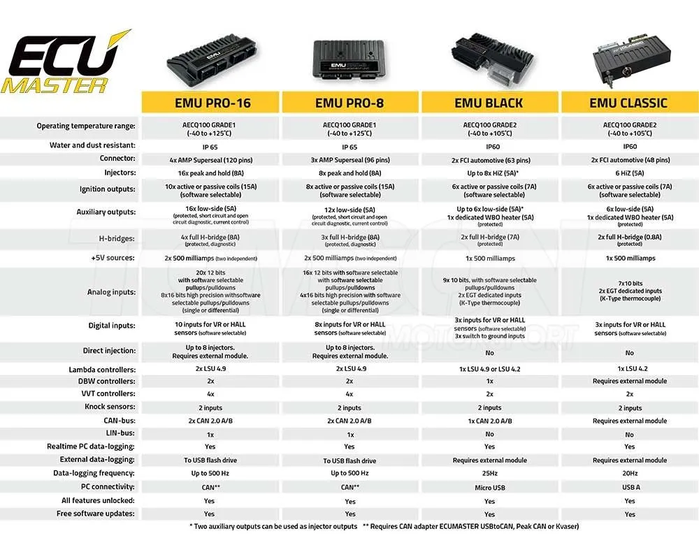 EMU PRO to samodzielny system zarządzania silnikiem przeznaczony do profesjonalnych zastosowań w motosporcie, z kompleksowym zestawem funkcji i ogromnymi możliwościami tuningu. Oferuje precyzyjną kontrolę układu napędowego w połączeniu z najwyższą elastycznością w dostosowywaniu kalibracji silnika do najbardziej wymagających projektów. EMU PRO występuje w dwóch wersjach: EMU PRO 16 do zastosowań z dużą liczbą wejść/wyjść oraz EMU PRO 8 (do maksymalnie 8 cylindrowych silników). SPECYFIKACJA: - Zaawansowany model zasilania paliwem obejmujący zamkniętą pętlę krótko- i długoterminowego dostosowania mieszanki w połączeniu z innowacyjnym modelem sterowania dawki paliwowa daje wyjątkową dokładność sterowania wtryskiwaczami. - Oprogramowanie zostało zaprojektowane tak, aby zapewnić użytkownikowi niespotykaną elastyczność konfiguracji. Użytkownik może dostosować rozmiary wszystkich tabel w programie oraz kanały używane na każdej osi tabeli. Można również zmieniać wartości na osi X i Y, co zwiększa dokładność odczytów tabeli w nieliniowych częściach opisywanego modelu. - Elastyczny system z niestandardowymi funkcjami, liczbami, wejściami CAN i eksportami CAN, dobrze znany z Power Management Unit (PMU) i Advanced Display Unit (ADU). -Obsługiwane typy silnika : Czterosuwowy, dwusuwowy, wankla; do 12 cylindrów -Obsługa czujników tlenu: 2x wewnętrzny kontroler LSU 4.9, obsługa do 4 czujników -Pełne wsparcie do obsługi 2x elektronicznych przepustnic (DBW) z automatyczną kalibracją -Obsługa do czterech zmiennych faz z automatyczną kalibracją -2 x CAN 2.0A/B, 1 x LIN bus -Obsługa dwóch czujników spalania stukowego -Zapis logów do zewnętrznej pamięci USB -Rejestracja danych do 500 Hz -8 [4] wejść EGT (lub precyzyjnych wejść analogowych). -Łącznie 46[31] wyjść i 30[24] wejść -Indywidualne ustawienia użytkownika, liczby, tabele i wyjścia -Wodoodporna obudowa IP 65 -Analiza parametrów on-line wyświetlana na wykresie *Funkcje wersji 8 podano w nawiasach kwadratowychProdukty marki Ecumaster nie są wysyłane do USA, Kanady i Meksyku. Ecumaster brand products are not shipped to the USA, Canada and Mexico.