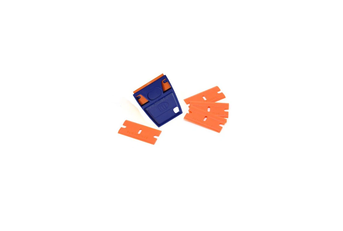 Plastic Razor Blade Holder & 5 Blades Zestaw składający się z 5 plastikowych dwustronnych ostrzy oraz przeznaczonego do nich uchwytu. Te plastikowe nożyki wykonują te same zadania, do których do tej pory używałeś metalowych żyletek. Z jedną istotną różnicą... są o wiele bardziej bezpieczne! W przeciwieństwie do metalowych żyletek, produkt EZ Grip Plastic Razor Blade nie uszkodzi takich powierzchni jak lakier czy szkło podczas usuwania naklejek, ptasich odchodów, żywic z drzew i innych lepkich zabrudzeń. Gdy trzeba usunąć starą naklejkę z szyby pojazdu,wiekszość osób sięga po staromodne stalowe ostrze żyletki. Ale co, gdy trzeba usunąć naklejkę z powierzchni nieregularnych lub chromowanych? Ostrze ze stali maszynki jest zbyt ostre i zbyt ryzykowne. EZ-Grip Plastic Razor Blades są wykonane z tworzywa sztucznego formowanego podczas wtryskiwania na gorąco, co zapewnia wytrzymałość i sztywność ostrzy. Plastik ten oferuje zwiększoną stabilność pionową i poziomą. Ma niski współczynnik tarcia, jest odporny na wiele chemikaliów i rozpuszczalników. Dla lepszego poślizgu, szczególnie na elementach delikatnych, jak lakier samochodowy, należy stosować wraz z lubrykantem, bądź quick detailerem dla lepszego poslizgu ostrza. Wraz z ostrzami w zestawie znajduje się plastikowy uchwyt, który zapewnia pewny stabilny chwyt ostrza i precyzję pracy. Pamiętaj, EZ-Grip Plastic Razor Blades są dwustronne! Zestaw zawiera uchwyt oraz 5 plastikowych żyletek. Istnieje możliwość dokupienia więcej żyletek osobno.