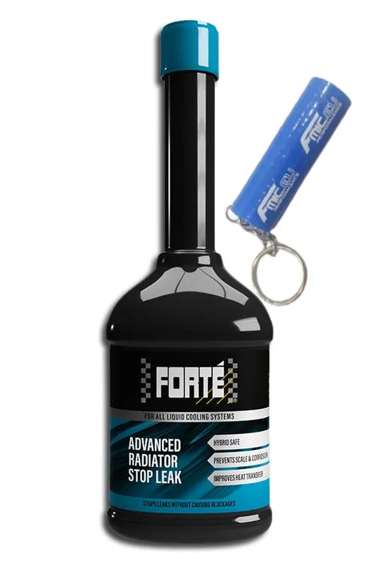 Forte Advanced Radiator Stop Leak Uszczelnia Wycieki Uszczelnia chłodnicę i inne elementy układu chłodzenia. Jest unikatową mieszanką naturalnych włókien i środków powierzchniowo czynnych, które działając razem zapewniają uszczelnianie pęknięć i porów w chłodnicach i układach chłodzących silników do średnicy 1,4 mm. Dodatkowo można stosować go profilaktycznie ponieważ chroni układ przed korozją. Preparat jest wysoce skuteczny i w 100% bezpieczny dla układu chłodzenia. Stosowany zgodnie z zaleceniami producenta zapewnia następujące korzyści: Zapobiega wyciekom płynu chłodzącego przez pęknięcia włoskowate i pory. Usuwa nieszczelności układu chłodzenia. Uszczelnia chłodnicę. Umożliwia przeprowadzenie doraźnej naprawy układu chłodzenia zapobiegającej utracie płynu chłodzącego i przegrzaniu całego układu, co mogłoby doprowadzić do kosztownego przestoju lub nawet uszkodzenia silnika. Umożliwia wykonanie długich przejazdów bez konieczności dokonywania kosztownych napraw i straty czasu, jeżeli dojdzie do wycieku z układu chłodzenia. Kierowcom ciężarówek umożliwia powrót do bazy bez konieczności dokonywania napraw przeciekającego układu chłodzenia w trasie. Uelastycznia gumowe uszczelnienia pompy wodnej W zestawie brelok FMIC