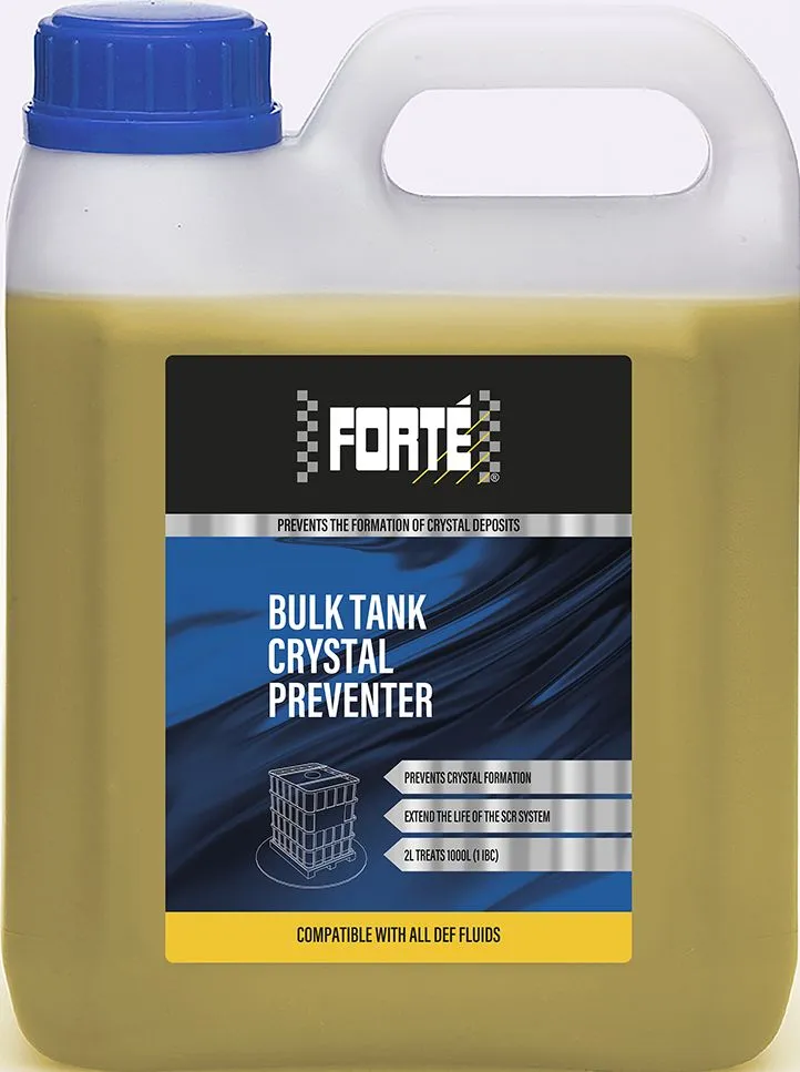 Bulk Tank Crystal Preventer Zapobiega powstawaniu kryształów w układzie AdBlue®, utrzymuje odpowiednie rozpylanie AdBlue®/DEF, poprawiając działanie systemu SCR. Zapewnia efektywne rozpylanie płynu do silników Diesla, zapobiega powstawaniu kryształów i utrzymuje działanie SCR/AdBlue®. Unika kosztownych napraw SCR/AdBlue®, eliminuje awarie i wydłuża żywotność systemu SCR. Skuteczny preparat od Forté zapobiegający krystalizacji dodatku Adblue oraz uszkodzeniom układu selektywnej redukcji katalitycznej SCR w silnikach wysokoprężnych zamontowanych w pojazdach komercyjnych (ciężarówki, autobusy itp.) Korzyści ze stosowania Forté Exhaust Crystal Preventer: 1. Zapobiega formowaniu się kryształów na elementach układu SCR: Zbiorniku płynu, Czujniku poziomu, Pompie, Wtryskiwaczu AdBlue, Katalizatorze SCR, NOx Trap 2. Rozpuszcza kryształy w zbiorniku AdBlue i czujniku poziomu 3. Poprawia wydajność układu SCR i obniża emisję Nox 4. Stabilizuje płyn AdBlue zapobiegając korozji 5. Wydłuża żywotność części układu Ad Blue 6. Zapobiega kosztownym naprawom Sposób użycia: Dodaj 2 litry na 1 IBC (1000 litrów) AdBlue®.