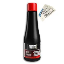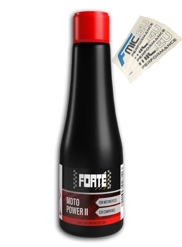 Zapewnia czyszczenie pierścieni tłokowych w motocyklach i silnikach zaburtowych. Jest wielofunkcyjnym środkiem dodawanym do benzyny w zbiornikach motocykli. Preparat jest wysoce skuteczny i w 100% bezpieczny dla układu paliwowego. Dolany do zbiornika motocykla i stosowany zgodnie z zaleceniami zapewnia następujące korzyści: Zapobiega starzeniu się benzyny i neutralizuje szkodliwe kwasy wytwarzane w wyniku zachodzących rekcji chemicznych. Chroni przed korozją i zapobiega odkładaniu się osadów żywicy i laku w układzie paliwowym. Usuwa Osady węglowe na zaworach dolotowych i wydechowych, w komorach spalania oraz w rowkach pierścieniowych tłoków. Zapobiega starzeniu się benzyny. Zapobiega zamarzaniu gaźników. Usuwa wilgoć z układu paliwowego. Ułatwia smarowanie górnej części cylindra, wtryskiwaczy i pompy paliwowej. Polepsza spalanie i zmniejsza emisję szkodliwych gazów wydechowych. Obniża zużycie paliwa i poprawia sprawność silnika. Dodaj preparat do maksymalnie 25l benzyny i wyjeździj paliwo do rezerwy. W tym czasie zalecamy wykonać ok 100 km jazdy z prędkościami autostradowymi. Jeśli zamierzasz zostawić pojazd na dłuższy czas bez uruchamiania silnika (np. zimowanie motocykla czy skutera wodnego) to koniecznie profilaktycznie dolej Forté Moto Power II do pełnego baku (najlepiej uruchom silnik i pozwól mu chwilę popracować, aby środek rozprowadził się po całym układzie). W zestawie trzy naklejki FMIC.EU