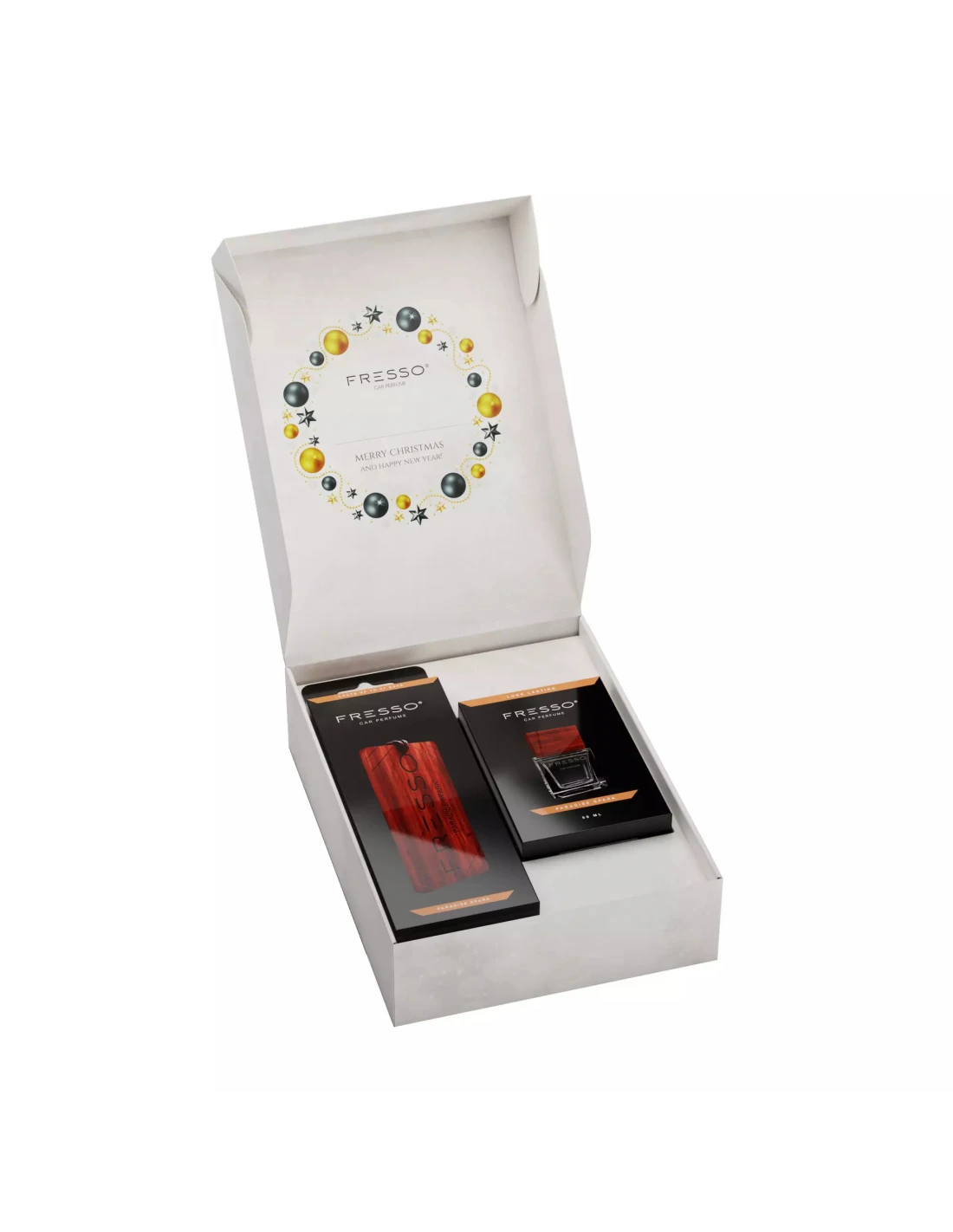 Gift Box Paradise Spark Pudełko zapachowe Gift Box to idealny pomysł na zapachowy upominek. Eleganckie, świąteczne pudełko zawiera zawieszkę oraz perfumy 50ml z tego samego zapachu. PARADISE SPARK Pozwól otoczyć się wonią zielonych i owocowych zapachów natury. Bukiet ten otwiera iskrząca cytrusowa mgła z nutami cytryny i bergamotki, która posypuje kwitnącą zieleń nutami świeżo ściętej trawy i chrupiącego jabłka. Cudowna miękkość konwalii staje się coraz bardziej widoczna by stworzyć przystań utkaną z bursztynu i mchu dębowego. DREWNIANA ZAWIESZKA Elegancka, drewniana zawieszka zapachowa wzbogacona w brązowy, pleciony sznurek to wyszukany dodatek, który będzie znakomicie pasował do każdego wnętrza samochodu. Zawieszka Fresso pozytywnie Cię zaskoczy, gdyż ma unikalną formę, a jej zapach jest trwały i genialnie skomponowany. Ze względu na naturalne pochodzenie zawieszki nieznacznie różnią się od siebie wyglądem tworząc przy tym unikalność i wyjątkowość produktu. Sposób użycia: Wyjmij zawieszkę z pudełka. Zdejmij folię i zamontuj zawieszkę pod lusterkiem. Uwaga! Powiesić zawieszkę swobodnie unikając kontaktu od powierzchni delikatnych, plastiku, skóry itp.. Producent nie ponosi odpowiedzialności za użytkowanie produktu niezgodne z jego przeznaczeniem. W przypadku złego samopoczucia lub zawrotów głowy natychmiast zaprzestać użytkowania produktu. WYJĄTKOWE PERFUMY Niezwykła kompozycja zapachowa, zamknięta w szklanym flakonie perfum Fresso zachwycą swą wyrazistą głębią. Nasadka wykonana z drewna podkreśla ich wyjątkowość i elegancję. Perfumy Fresso dawkuj tak jak lubisz, intensywność zapachu zależy tylko od Ciebie. W każdym momencie możesz odświeżyć i wzmocnić delikatną woń, która na nowo wypełni Twoje auto. WYSOKA WYDAJNOŚĆ Receptury naszych zapachów są rezultatem pracy znakomitych specjalistów, którzy wykorzystali do ich stworzenia unikalne i drogocenne składniki. Flakonik o pojemności 50 ml zadziwi Cię swą wydajnością. Subtelny zapach, uzyskany po aplikacji 5 dawek perfum będzie utrzymywał się w Twoim samochodzie nawet do kilku dni ! Sposób użycia: Rozpyl perfumy w odległości ok. 20cm w kierunku dywaników materiałowych, tworząc mgiełkę. W przypadku gumowych dywaników, przetestuj perfumy na niewidocznym elemencie tapicerki, upewniając się, że nie pozostawiają śladu. Unikać wielokrotnej aplikacji w tym samym miejscu. Kierować strumień z dala od twarzy. Nie stosować do ciała. Rozkoszuj się długotrwałym i wyjątkowym zapachem. Producent nie ponosi odpowiedzialności za użytkowanie produktu niezgodne z jego przeznaczeniem. Produkt przechowywać w pozycji pionowej. W przypadku złego samopoczucia lub zawrotów głowy natychmiast zaprzestać użytkowania produktu. Nie pozostawiać w temperaturze powyżej 75 stopni Celsjusza. Czynniki obniżające trwałość oraz wyczuwalność zapachu: Niska temperatura (poniżej 5 stopni Celsjusza) lub skrajnie wysoka temperatura (powyżej 30 stopni Celsjusza) Regularne zostawianie auta w pełnym słońcu Brak utrzymywania czystości w aucie Obecność innych (również zużytych) zapachów w aucie Przyzwyczajenie do zapachu Brak okresowego czyszczenia klimatyzacji Intensywny zapach tapicerki w aucie Zestaw zawiera: Perfumy Paradise Spark 50ml Zawieszkę Paradise Spark