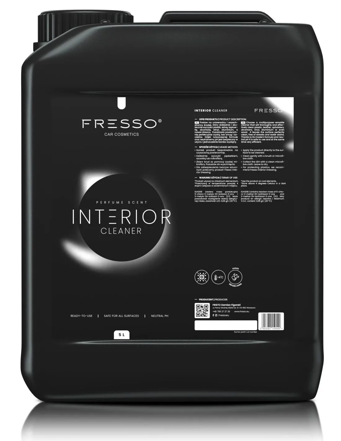 Interior Cleaner Postaw na uniwersalny i wszechstronny środek, który dokładnie i skutecznie wyczyści plastik, skórę, tapicerkę, alcantarę, winyl, aluminium, a nawet drewno. Pozostawia powierzchnię perfekcyjnie czystą, bez smug i zacieków. Dzięki nowoczesnej formule oraz neutralnemu pH jest bezpieczny w użyciu i jednocześnie bardzo wydajny. Przyjemny, perfumowany zapach utrzymuje się na czyszczonej powierzchni, umilając chwile spędzone w samochodzie, ale nie tylko... Doskonale sprawdzi się również w domu, do czyszczenia blatów wykonanych z drewna, marmuru czy granitu, a także płytek, armatury, aluminium oraz mebli. Dzięki swojej wyjątkowej formule pozostawia powierzchnię całkowicie gładką, minimalizując ponowne osadzanie się kurzu i innych zabrudzeń. Cechy produktu: Gotowy do użycia Wszechstronne zastosowanie Czyści tapicerkę, skórę, plastiki, alcantarę, gumę, winyl, aluminium, drewno Neutralne pH Nie odbarwia, nie pozostawia smug ani osadu. Nie pozostawia lepkich pozostałości Bezpieczny w użyciu Świetnie nadaje się do czyszczenia zabrudzeń w domu/biurze (blatów drewnianych, marmurowych, płytek, armatury, mebli, aluminium) Dzięki swojej wyjątkowej formule pozostawia powierzchnię całkowicie gładką, minimalizując ponowne osadzanie się kurzu i innych zabrudzeń. Zapach perfumowany Cytrusowo-aromatyczny. Archetyp czystości i eterycznej wręcz świeżości. Cytryna w rewolucyjnej zielonej kwaśności w połączeniu z piżmem sprawiają, że jest to zapach niezapomniany. Delikatne akordy subtelnych, pudrowych kwiatów i owoców wzbogacają wrażenie przyjemnego odświeżenia i powodują, ze zapachowi ciężko się oprzeć. Sposób użycia Nanieś produkt bezpośrednio na czyszczoną powierzchnię. Delikatnie wyczyść pędzelkiem, szczotką lub mikrofibrą. Zbierz brud za pomocą czystej mikrofibry. Pozostaw do wyschnięcia. Dla zabezpieczenia tworzyw sztucznych polecamy produkt Fresso Interior Dressing. Dodatkowe informacje: Produkt używaj na chłodnych elementach W przypadku trudniejszych zabrudzeń, po aplikacji pozostaw produkt na około minutę Przechowuj w temperaturze powyżej 4 stopni Celsjusza w zaciemnionym miejscu Pojemność: 5000ml