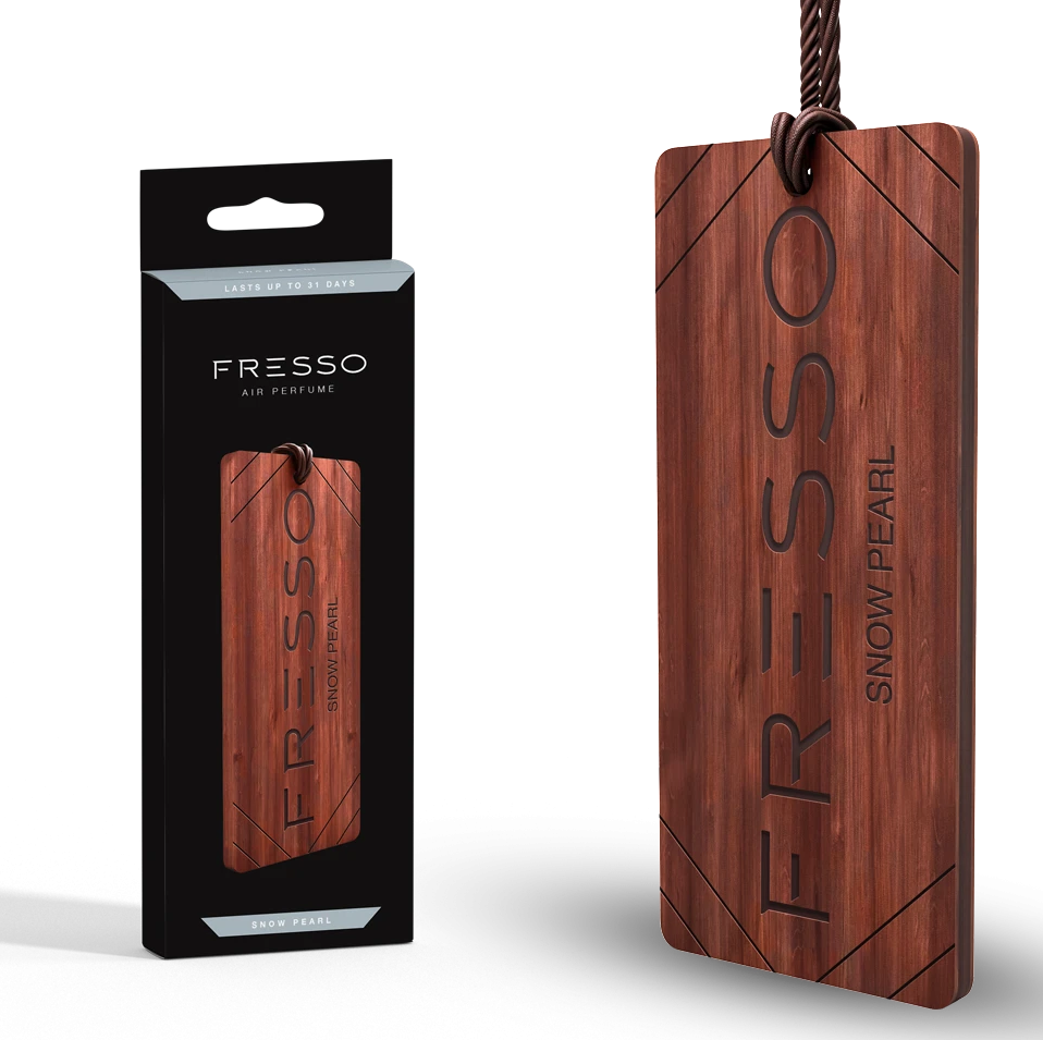 SNOW PEARL Esencjonalne połączenie cytrusów w towarzystwie jedwabistego jaśminu i kwiatu ylang ylang, tworzy lekką otulającą kompozycję, którą subtelnie podkreślają i wzmacniają nuty drzewne z domieszką wanilii. DREWNIANA ZAWIESZKA Elegancka, drewniana zawieszka zapachowa wzbogacona w brązowy, pleciony sznurek to wyszukany dodatek, który będzie znakomicie pasował do każdego wnętrza samochodu. Zawieszka Fresso pozytywnie Cię zaskoczy, gdyż ma unikalną formę, a jej zapach jest trwały i genialnie skomponowany.Ze względu na naturalne pochodzenie zawieszki nieznacznie różnią się od siebie wyglądem tworząc przy tym unikalność i wyjątkowość produktu. Sposób użycia: Wyjmij zawieszkę z pudełka. Zdejmij folię i zamontuj zawieszkę pod lusterkiem. Uwaga! Powiesić zawieszkę swobodnie unikając kontaktu od powierzchni delikatnych, plastiku, skóry itp.. Producent nie ponosi odpowiedzialności za użytkowanie produktu niezgodne z jego przeznaczeniem. W przypadku złego samopoczucia lub zawrotów głowy natychmiast zaprzestać użytkowania produktu. Czynniki obniżające trwałość oraz wyczuwalność zapachu: Niska temperatura (poniżej 5 stopni Celsjusza) lub skrajnie wysoka temperatura (powyżej 30 stopni Celsjusza) Regularne zostawianie auta w pełnym słońcu Brak utrzymywania czystości w aucie Obecność innych (również zużytych) zapachów w aucie Przyzwyczajenie do zapachu Brak okresowego czyszczenia klimatyzacji Intensywny zapach tapicerki w aucie