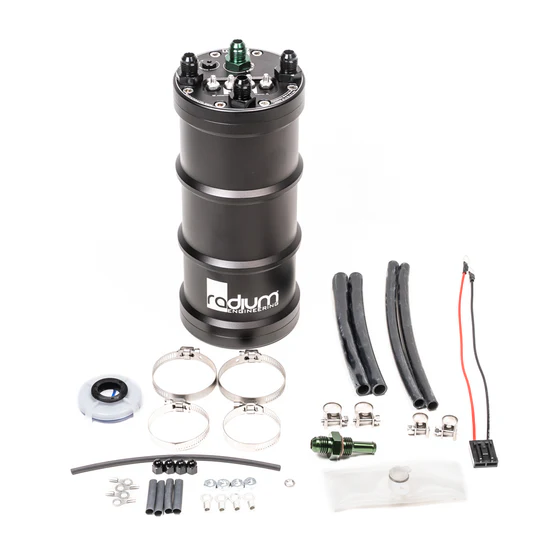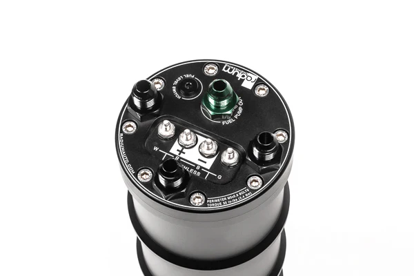 A fuel surge tank (FST) is designed to prevent starvation to the engine on vehicles with inadequate fuel tank baffling. The surge tank also provides a quick and easy way to upgrade any standard fuel system without the need to modify the stock fuel tank or pump. It is also an excellent fueling solution for vehicles installing large fuel demand power upgrades such as forced induction. HOW AN FST WORKS The volume of fuel inside the surge tank acts as a buffer to always keep the FST pump supplied with fuel. This volume is maintained by the main fuel tank's pump as well as the fuel returning from the fuel pressure regulator. Excess fuel in the surge tank is returned back to the vehicle's main fuel tank. PLUMBING All adapter fittings on top of the FST are 6AN (9/16"-18) male. The internal FST pump directly feeds the fuel rail(s), through the green 6AN bulkhead fitting. The pump outlet fitting is available in -6AN male size only. The 3 black (interchangeable) 6AN ORB fittings are used for the following.A. Fuel entering the FST (from the lift pump)B. Fuel overflowing and leaving the FST (to main tank)C. Fuel returning from the fuel pressure regulator NOTES: An internal flow deflector prevents fuel foam and aeration on all 3 ports. The pumps mount internally using tubing that is gasoline, ethanol, and methanol resistant. The overflow to the main tank is a requirement on all installations. Tanks without return ports will need customization of the hanger top or filler neck to create a port for the overflow. ELECTRICAL The anti-rotation stainless electrical studs easily handle the high current demand that compact multi-pin bulkhead connectors lack. These serviceable connections are hermetically sealed and impervious to all standard and exotic fuels. Non conductive anodized aluminum acorn nuts are provided to prevent any accidental short circuiting. Electrical hardware is included for the fuel pump. Furthermore, the in-tank wiring is insulated with high quality chemically resistant ETFE. Relay kits, such as 17-0031, are recommended to drive these new internal fuel pump. PUMP COMPATIBILITY This system supports the following fuel pumps (sold separately): *Walbro F90000267 *Walbro F90000274 *Walbro F90000285 *Walbro F90000295 *Walbro GSS341 *Walbro GSS342 *AEM 50-1000 *AEM 50-1200 *AEM 50-1220 **Bosch BR540 **Deatschwerks DW400 **Deatschwerks DW440 (brushless) **Deatschwerks DW810 (brushless) **Protec 11928 (brushless) **Fuelab 49614 (brushless) *Ti Automotive E5LM (brushless) *Sock filters are provided in this kit for these pumps.**Sock filters are included from the fuel pump manufacture. INCLUDED Extruded anodized aluminum 1.5 liter canister Removeable O-ring sealed billet aluminum caps 6AN O-ring fittings Corrosive resistant stainless steel hardware Stainless clamps for 39-45mm diameter pumps Large and small ID pump connections Plug and Play pump wiring Pre fuel pump sock filters Anti-rotation Electrical Terminals Instruction PDF Volumes & Dimensions PDF