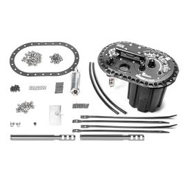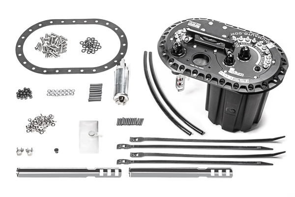 FCST-X FEATURES LEGACY FCST FEATURES The features listed below carry over from previous fuel cell surge tanks. Merged single 10AN ORB female threaded outlet. All pumps use check valves that prevent back-flow. One-way fill valves (355LPH each) allows fuel in, but not out, keeping the surge tank full. Multiple fuel pump options including gerotor, reaction turbine, and brushless DC motor pumps. Hermetically sealed high-current stainless steel electrical studs capable of handling all pumps. Simplified servicing eliminates sealing washers and fuel cell retaining brackets. Full CNC aluminum construction with anodized surfacing for superior corrosion resistance. Fuel compatibility: leaded and unleaded gasoline, methanol, ethanol, E85, etc. Optional fuel surge tank level switch and diagnostic LED failsafe port. Rollover vent valve protection NEW FEATURES In addition to all previous FCST features, the new FCST-X rendition is packed with innovations. Fast lift and surge pump access (9 bolts total) Integrated lift handle for fuel pump servicing Lightweight surge tank increased from 2.2L to 2.6L Compatible with up to 4 brushless fuel pumps Up to 4 Bosch BR540 fuel pumps (DW400) Up to 3 Ti Automotive E5LM brushless pumps Up to 4 brushless Bosch pumps (DW440) Compatible with 16AN inlet mechanical pumps Easily swappable pump modules (sold separately) Compatible with shrouded level sensors Designed with less potential leak points Improved fluid control for quick filling Optimized internal fluid management Enhanced roll over protection Anti-rotation electrical terminals COMPATIBLE WITH MY FUEL CELL? To install a Radium Engineering FCST-X into a fuel cell, the following criteria must be met: The fuel cell must have the industry standard 6"x10", 24-bolt flange opening. The opening must be on the top face of the fuel cell (i.e. not a side face). The cell depth must be at least 7.7" (196mm) measured from the outer top face to the internal bottom face. WHATS IN THE BOX? The following comes standard with every FCST-X variation Anodized aluminum 6x10 plate Anodized aluminum surge tank pump hat Anodized aluminum lift pump hat Anodized aluminum service handle Anodized aluminum level sensor plate Anodized aluminum surge pump bracket Stainless lift pump mounts (shallow and deep) Lift pump and surge pump fuel filters Anodized aluminum 8AN roll over vent valve FKM refueling rollover protection seal FKM 6x10 24-hole sealing gasket 8AN ORB to 6AN male return fitting 10AN ORB to 8AN male pump out fitting 2AN ORB fuel level switch plug FKM 1-way fill valves (x3) Anodized aluminum acorn nuts Electrical wire ring terminals 20-1990-01 This FCST-X is preassembled with 1 Walbro GSS342 lift pump and 1 Walbro GSS342 surge tank pump. Instruction PDF