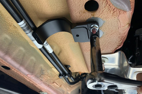Hardware for installing a Radium Engineering fuel filter in the MK5 Supra. The upper half of the billet aluminum clamp secures to OEM threaded studs using the provided flange nuts. These studs are on the opposing side of the plastic undertray just to the left of the transmission.