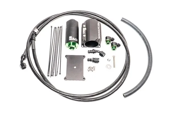 The Radium Engineering fuel surge tank hanger permits the use of 1, 2, or 3 aftermarket high pressure pumps and 1 lift pump in the stock Mazda FD RX7 fuel tank. It is compatible with following models:93-95 Mazda FD RX-7 (US)92-02 Mazda FD RX-7 (JDM) FUEL FEED KITS: 20-0455-0X FUEL HANGER FEED KIT, FD RX7 The feed kits use high flowing -8AN fuel lines. A Radium 1/2" fuel/PCV feed hose runs from the fuel pump hanger outlet to a Radium Engineering fuel filter secured to the rear subframe. From there a pre-made -8AN PTFE feed line runs all the way to the engine bay where it is up to the user to adapt the 45 degree hose end to their specific fuel system. The fuel lines clear the OEM fuel pump cover and all suspension related parts. No cutting or drilling is required to get the feed line past the fuel tank. The included Radium Engineering fuel filter assembly mounts to the rear subframe underneath the vehicle using a specifically designed FD RX7 bolt-on billet mount. The filter is mounted through a Radium Engineering heat exchanger to keep fuel temperatures down. Depending on the kit selected (-01,-03, -05), the fuel filter will be assembled with 1 of 3 different elements. INCLUDES-Fuel Filter (-03 Stainless, or -05 Microglass)-Fuel Filter Heat Exchanger Bracket (Laser engraved graphics may vary)-FD RX7 Fuel Filter Mount-8AN PTFE Fuel Feed Hose-Radium Fuel/PCV 1/2" Hose-Black 8AN Adapter Fittings-Black 8AN Hose Ends-Stainless Steel Hardware