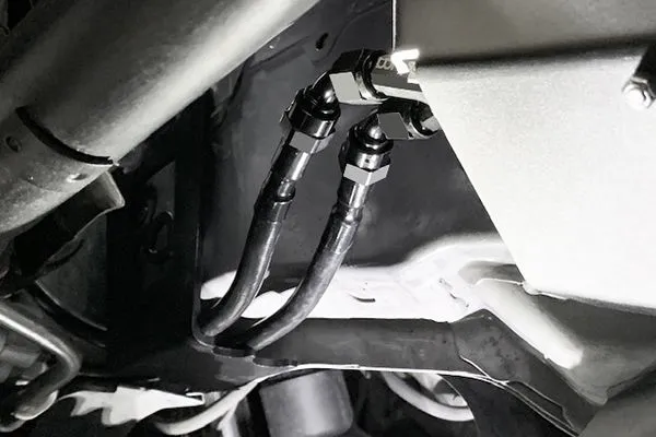 20-0851-0X FUEL HANGER FEED KIT, NISSAN R35 GT-R NOTE: The fuel hanger feed kit is compatible in LHD (left hand drive) vehicles only.If installing a Radium in-tank fuel hanger with high-flow aftermarket pumps, the stock R35 fuel lines may not be sufficient. The fuel hanger feed kits include everything required to connect all 20-055X-0X Radium fuel hangers directly to Radium fuel rails. It comes with new PTFE feed lines and re-uses the factory feed line as the return for the regulator.When selecting a feed kit, first choose the filter element type. Stainless steel elements can be cleaned and re-used, while microglass provides better filtration efficiency, but cannot be re-used. The fuel filters provided in the 20-0851-03 and 20-0851-05 feed kits feature an integrated check valve to hold fuel pressure after the engine is shut OFF. Because fitment is extremely tight, the -10AN "PUMPS" outlet is first split into two -6AN feed lines. The dual 6AN PTFE lines run parallel under the vehicle and are secured using billet aluminum retainers with OEM hardware. The dual -6AN PTFE lines run through a serviceable fuel filter that secures using a GT-R specific heat shield. Depending on the kit selected (-03 or -05), the fuel filter will be assembled with the appropriate elements.  The 2 lines split and are ready to be installed into the 6AN male fittings on the front ports of the fuel rails (not included). INCLUDES-Check Valve Filter (-03 Stainless, -05 Microglass)-10AN ORB to 10AN Male Low Profile Fitting-10AN to 6AN Y-Adapter Fittings (x3)-Fuel Line Retaining Mounts (x5)-R35 Filter Heat Shield Bracket-60mm 2-Piece Filter Clamp-6AN PTFE Fuel Hoses (x4)-Stainless Steel Hardware Instruction PDF