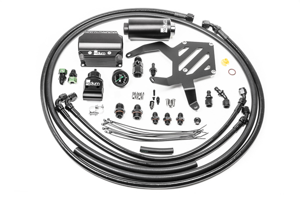 The fuel hanger plumbing kits convert the OEM returnless system to a traditional return system. They include everything required to connect directly to the OEM or aftermarket fuel rails for both single and dual pump configurations. A -8AN PTFE hose attaches to a Radium Engineering fuel filter that mounts underneath the vehicle using a chassis-specific bolt-on bracket. Depending on the kit selected (-03 or -05), the fuel filter will be assembled with 1 of 2 different elements.