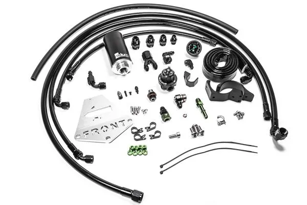 20-1326-03/5 FUEL HANGER PLUMBING KIT, 10-15 CAMARO LS3/LS7/L99VEHICLE COMPATIBILITY10-15 Camaro LS3/LS7/L99 These fuel hanger plumbing kits are identical with one exception, the filter media:20-1326-03 uses a 10 micron stainless steel element.20-1326-05 uses a 6 micron microglass element. The Camaro plumbing kits feature dual 6AN PTFE feed lines that route from the fuel hat to the fuel filter wo fuel lines are required here for the following reasons:1. A single 8AN fuel line will not fit between the fuel tank and the unibody. The larger combined surface area of two 6AN lines fits nicely.2. The back half of the OEM fuel line is reused. The stock fuel line incorporates the OEM fuel pressure sensor that is needed for ECU diagnostics.The rest of the stock fuel feed line is repurposed as a 6AN return line. The kit includes 4 green anodized hose retaining adapters with clamps. The included fuel filter incorporates a built-in check valve. The Camaro-specific fuel filter mount does NOT require any permanent vehicle modifications. Thermal insulating sleeve is included to protect against chaffing and excessive exhaust heat. Billet aluminum clamp secures the 8AN PTFE hose downstream away from the header. The 8AN PTFE line from the fuel filter feeds the RH fuel rail. A fuel pressure regulator and pressure gauge mounts directly to the LH fuel rail. Radium Engineering fuel rails and fuel rail plumbing kits are required A 6AN PTFE fuel line is provided that connects the FPR return port to the OEM fuel feed hard line. Instruction PDF