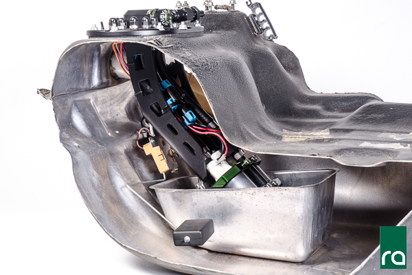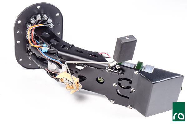 The Radium fuel pump hanger allows the use of 1 or 2 aftermarket high-flow fuel pumps. The machined assembly mounts in the factory fuel tank using the OEM gasket and hardware. The fuel level sender and temperature sensors are retained.