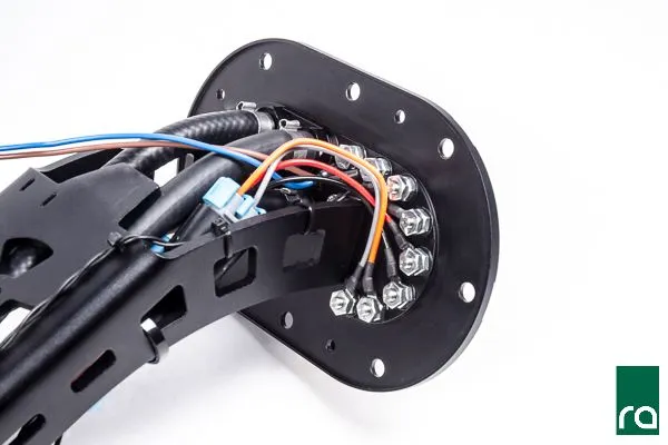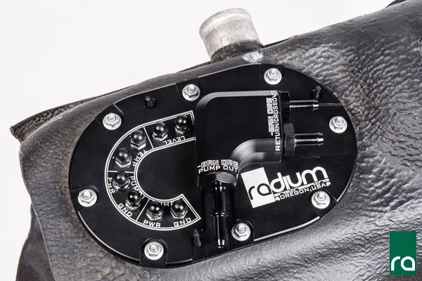 VEHICLE COMPATIBILITY 93-07 Subaru Impreza (including WRX & STi)97-08 Subaru Forester (All)89-99 Subaru Legacy (All)94-99 Subaru Outback (All)05-06 Saab 9-2X*NOT COMPATIBLE WITH JDM WRX STi SPEC C The Radium fuel pump hanger allows the use of 1 or 2 aftermarket high-flow fuel pumps. The machined assembly mounts in the factory fuel tank using the OEM gasket and hardware. The fuel level sender and temperature sensors are retained. The pumps merge into a single port outlet with 8AN ORB threads. The crossover and return uses 6AN ORB threaded ports. To simplify plumbing, the kit includes OEM hose adapter fittings for all model years listed. Shown below is for mid model years which use a SAE quick disconnect fuel feed. There is also a return line SAE quick disconnect fitting included for newer models. Lastly, -6AN male fittings are included for those that use aftermarket feed and return hoses. The custom designed stainless electrical studs easily handle the high current demand that compact bulkhead connectors lack. These serviceable connections are properly sealed and impervious to all standard and exotic fuels. The low profile design keeps all wiring tucked nicely underneath the OEM cover plate. Nonconductive acorn nuts are provided to prevent any accidental short circuits. Furthermore, the high quality in-tank wiring is insulated with chemically resistant ETFE. Stainless steel crimp-on ring terminals and heat shrink are provided for external wiring connections. The kit includes a venturi jet pump with a new integrated pressure relief valve that is optimized for high flow pump(s). The kit also includes a streamlined anodized aluminum collector box, shown below. Unlike the 2004-2007 WRX STi OEM variation, the Radium Engineering collector box has been optimized to work in ALL gas tanks. Shown below is the smallest OEM gas tank baffle found in the model list above. It improves the fuel supply around the pump(s) inlet. There is a 1-way fill valve incorporated on the front side of the tank that flows 355LPH. It serves as a trap door keeping the pump(s) supplied with fuel during aggressive driving. Furthermore, all returning fuel from the pressure regulator return and the crossover hose enter the collector box keeping it full. The OEM fuel level and fuel temperature sensors secure to the mounting bracket. Single pump applications can reuse the OEM fuel pump controller, but it is recommended to upgrade the wiring as high flow fuel pumps draw additional current requiring larger gauge wire. Fuel pump wiring kits can be purchased HERE. Select qty1 for single pump applications and qty2 for dual pump applications. Features-Anodized Aluminum Laser Etched Plate-Anodized Aluminum Collector Box and Check Valve-Anodized Aluminum Venturi Jet Pump-Anodized Aluminum Fittings for All Model Years-Anodized Aluminum Dual Pump Mounts-ETFE Wire with Stainless Steel Terminals-Submersible Rubber Fuel Hose -Stainless Steel Hardware and Clamps Configuration There will be enough components included to use 1 or 2 fuel pumps. Depending on the setup, some parts will simply not be used. A pliable fuel pump filter sock like this HERE must be used for proper fitment. Note: This kit eliminates the OEM hanger's "post" fuel pump filter. A low micron aftermarket fuel filter should be installed downstream to protect the injectors from debris. It is recommended to use this early Subaru-specific fuel filter HERE. This system is compatible with the following fuel pumps:20-0342-00Walbro F90000267Walbro F90000274Walbro F90000285 20-0340-00Walbro GSS342 255lphAEM 50-1200 Instruction PDF