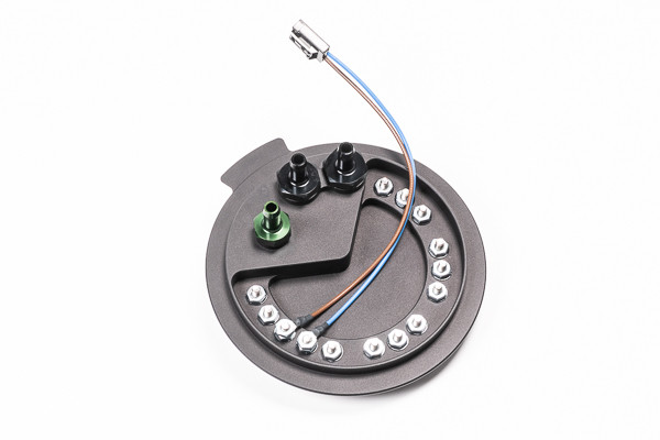 An additional fuel pump with a pre pump filter sock is integrated into the OEM fuel collector basket. The fuel from this new pump is sent out of the fuel hat through a low-profile 8AN male adapter fitting.