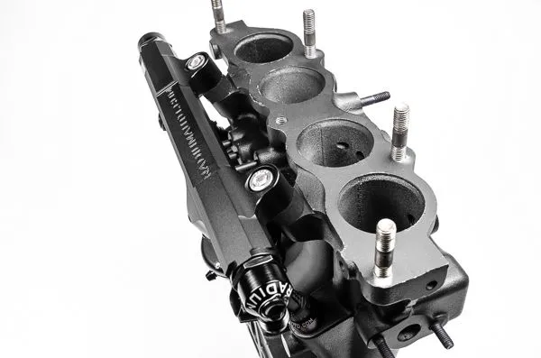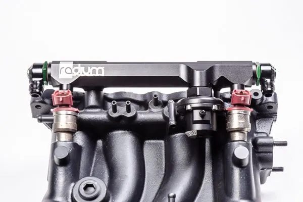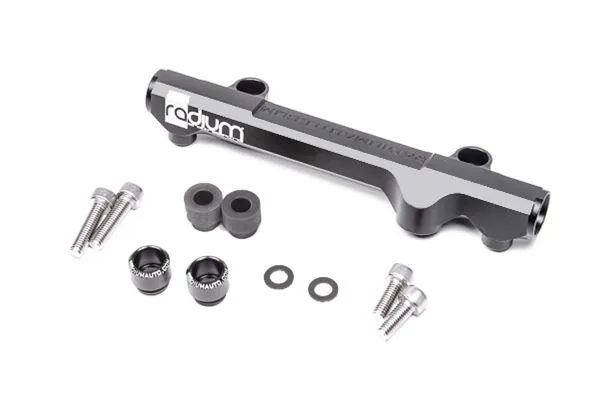 The Radium Engineering high flow secondary fuel rail is for the 13B-RE rotary engine originally found in the 1990-1995 Mazda/Eunos Cosmo. The aluminum fuel rail is anodized black for compatibility with all popular fuel types including E85. Manufactured with a large internal bore, the fuel rail can support all necessary engine power requirements. Like the stock fuel rail, the rail features 11mm injector bores permitting the use of OEM fuel injectors