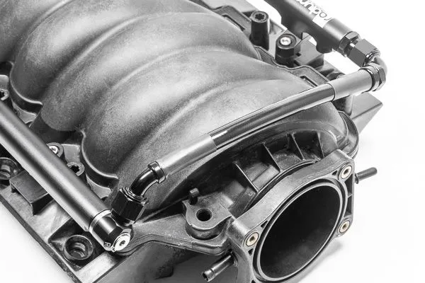 The inlet fitting permits the use of the OEM SAE quick connector. A PTFE -8AN crossover hose is used for the front of the rails. Plugs are provided for all unused ports: (LH rear, RH rear port, and RH center).