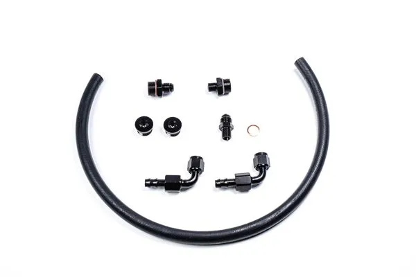 The plumbing kit includes the items shown in the image below and allows easy hookup to the factory feed line. It is intended to be used with the factory pressure regulator, but can also work with an aftermarket regulator.
