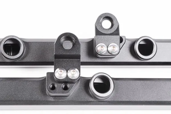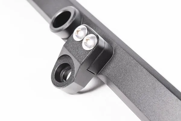 Manufactured with a large 0.69" internal bore, the fuel rails can support all necessary engine power requirements. They are CNC machined from extruded 6063 aluminum, black anodized, and laser etched for a high quality surface finish. All end ports are machined with 8AN ORB (3/4-16 female) threads. The lower center ports can be used for optional adapters and are also tapped with 8AN ORB (3/4-16 female) threads.