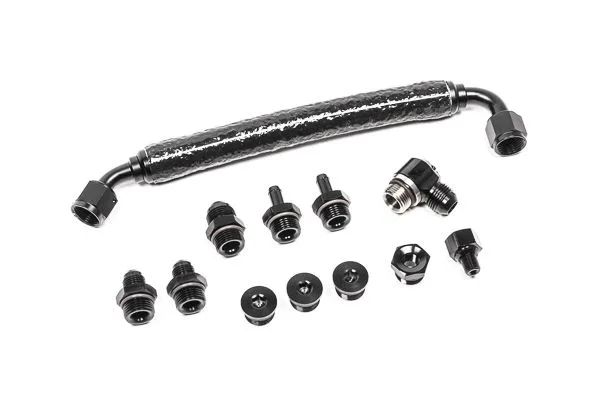 The plumbing kit includes adapter fittings and plugs permitting a bolt-on affair with the OEM fuel lines.