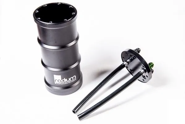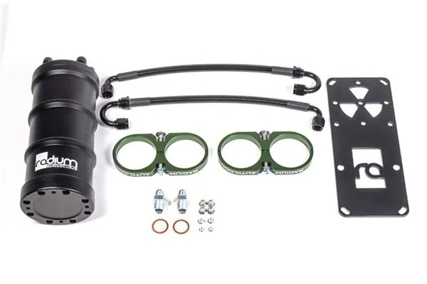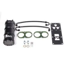 A fuel surge tank (FST) is designed to prevent fuel starvation to the engine on vehicles with inadequate fuel tank baffling. The FST fuel pumps feed the fuel rail(s). The volume of fuel inside the surge tank acts as a buffer to always keep the FST pump supplied with fuel. This volume is maintained by the main fuel tank's pump as well as the fuel returning from the fuel pressure regulator. Excess fuel in the surge tank is returned back to the vehicle's main fuel tank. The surge tank also provides a quick and easy way to upgade any standard fuel system with a compact size. This is an excellent fueling solution for vehicles installing large demand power upgrades such as forced induction. Both of these dual-pump configurations are ideal for high powered V or H configured engines with dual fuel rails. The anodized 6061 billet aluminum clamps and FST mount directly to the powder coated aluminum plate using stainless countersink bolts. Unlike others on the market, these clamps conductively transfer the fuel pumps thermal energy to the chassis increasing fuel pump longevity. Each pump has a dedicated vapor shield hose that draws fuel from the bottom of the FST. Includes -Machined 6061 Aluminum 1.5 Liter Canister-Removeable Billet 6061 Aluminum Caps -6AN Male Fittings -Adapter Fittings for specified Fuel Pumps-Billet Aluminum Pump Clamps-Aluminum Mounting Bracket-Stainless Steel Hardware NOT COMPATIBLE WITH AEM 50-1005 or DW350iL pumps. Instruction PDF