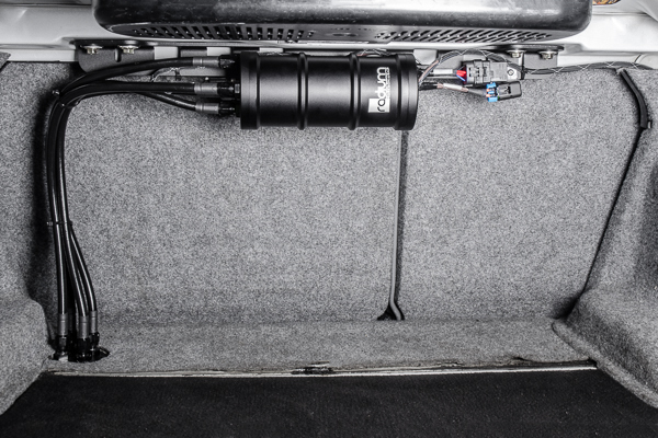 The BMW install kit locates the FST in a collision-safe area of the trunk behind the rear seat. The bolt-on aluminum mounting bracket features rubber isolating grommets to reduce fuel pump noise. Also included is a weatherproof fuse and relay to drive the new FST fuel pump. A Delphi weatherpak connector is also provided for the fuel pump trigger activation to make the entire system modular.