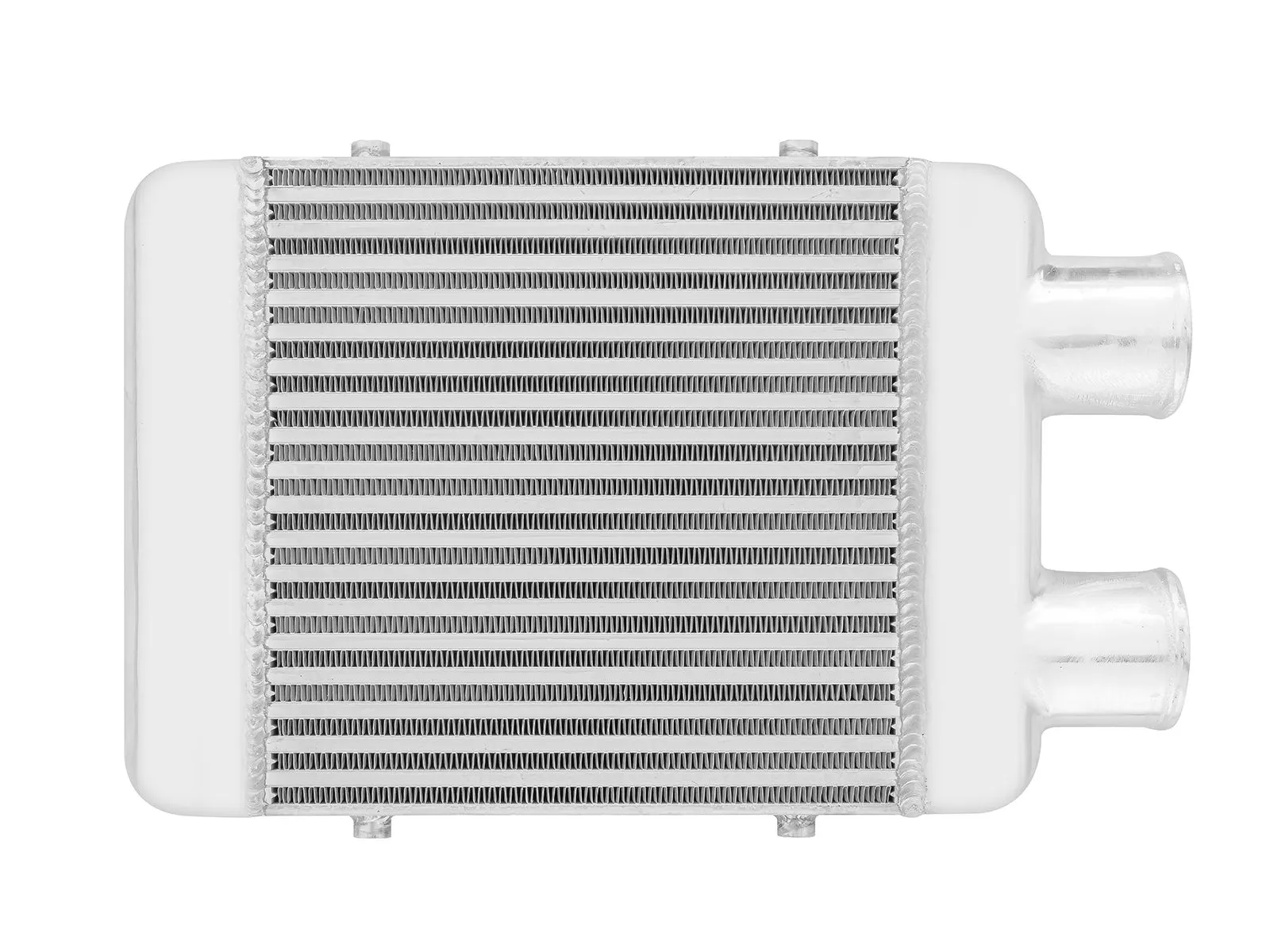 Intercooler o wymiarach rdzenia: 300x300x76mm, wymiar całkowity: 420x300x76mm, przespawany wlot i wylot na jedną stronę o średnicach 76mm, wystarczający do mocy 350KM. Posiada bardzo wydajny rdzeń, grube ścianki wykonane z najwyższej jakości polerowanego aluminium, co gwarantuje ogromną wytrzymałość, świetne chłodzenie, a także doskonałe przepływy powietrza (w przeciwieństwie do intercoolerów z samochodów dostawczych nie "zapychają" dolotu). Znakomicie zastępują seryjne intercoolery zwiększając osiągi samochodu. Świetnie sprawdza się w samochodach mających orurowanie idące z turbo i do kolektora po jednej stronie samochodu. Nasze intercoolery były testowane do 5 barów - nawet tak duże ciśnienie nie robi na nich żadnego wrażenia. Wszystkie sprzedawane na naszych aukcjach intercoolery posiadają nowy, dużo wydajniejszy rdzeń drugiego typu! Stary rdzeń widoczny po prawej stronie miał bardzo rzadko ułożone żeberka, do tego tylko w jednym rzędzie (patrząc przez wlot było widać wylot), co skutkowało słabym chłodzeniem - przelatujące nim powietrze nie oddawało całego ciepła. Oferowane na naszych aukcjach intercoolery posiadają dużo gęstszy, naprzemiennie ułożony radiator, co gwarantuje ogromną poprawę chodzenia! Intercooler jednostronny jest robiony na indywidualne zamówienie. Czas oczekiwania od 1 do 2 dni roboczych!!!